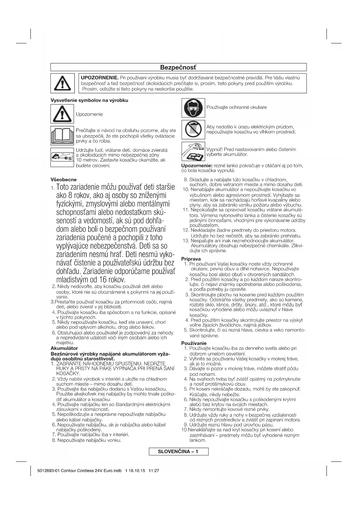 zastrihávaní – predmety môžu byť vyhodené rezným lankom. 5012693-01 Contour Cordless 24V Euro.indb 1 16.10.15 11:27SLOVENČINA – 2