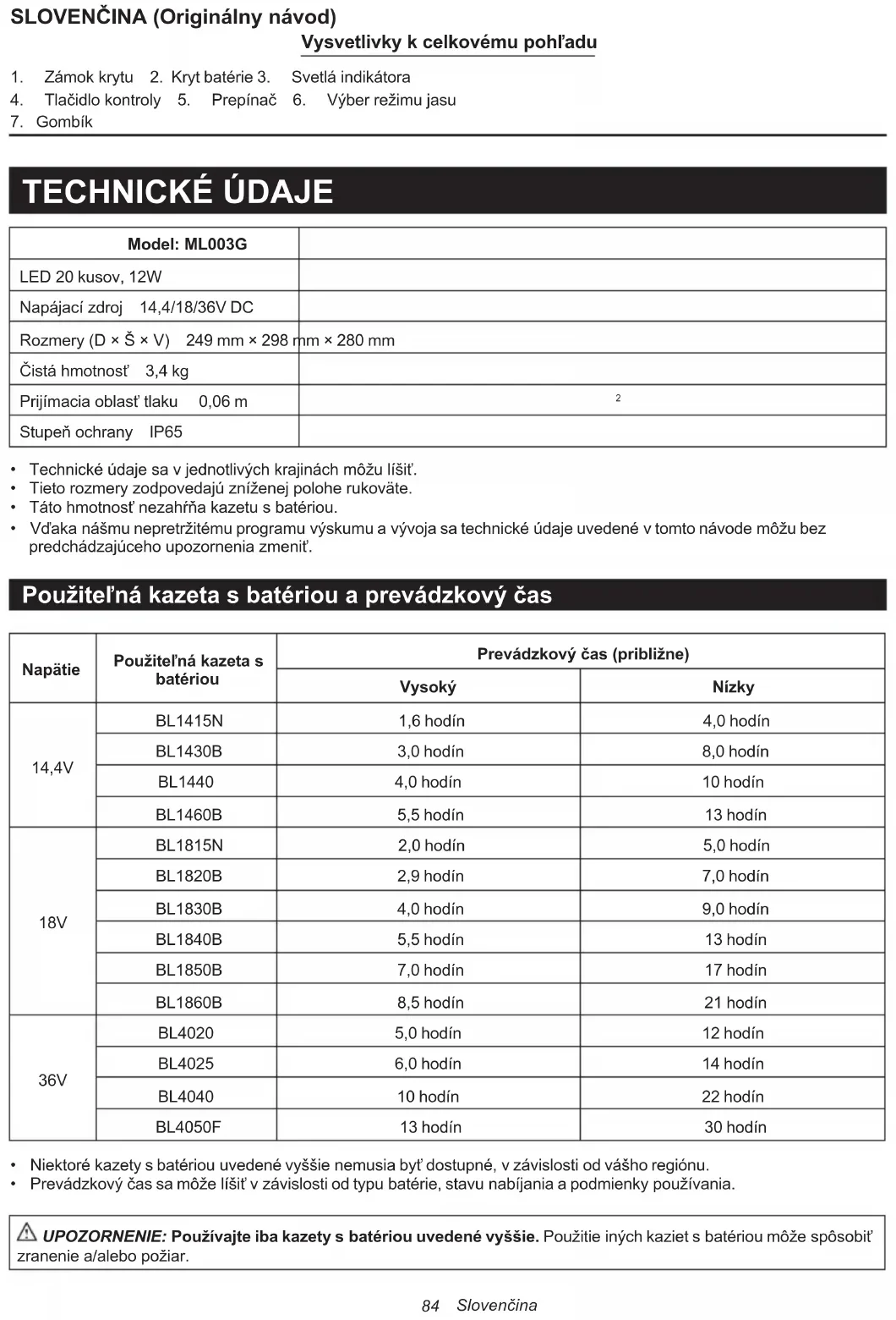 - Vďakanášmunepretržitémuprogramuvýskumuavývojasatechnickéúdajeuvedenévtomtonávodemôžubez predchádzajúcehoupozorneniazmeniť. Použiteľná kazeta s batériou a prevádzkový čas Napätie Použiteľná kazeta s batériou Prevádzkový čas (približne) Vysoký Nízky 14,4V BL1415N 1,6 hodín 4,0 hodín BL1430B 3,0 hodín 8,0 hodín BL1440 4,0 hodín 10 hodín BL1460B 5,5 hodín 13 hodín 18V BL1815N 2,0 hodín 5,0 hodín BL1820B 2,9 hodín 7,0 hodín BL1830B 4,0 hodín 9,0 hodín BL1840B 5,5 hodín 13 hodín BL1850B 7,0 hodín 17 hodín BL1860B 8,5 hodín 21 hodín 36V BL4020 5,0 hodín 12 hodín BL4025 6,0 hodín 14 hodín BL4040 10 hodín 22 hodín BL4050F 13 hodín 30 hodín