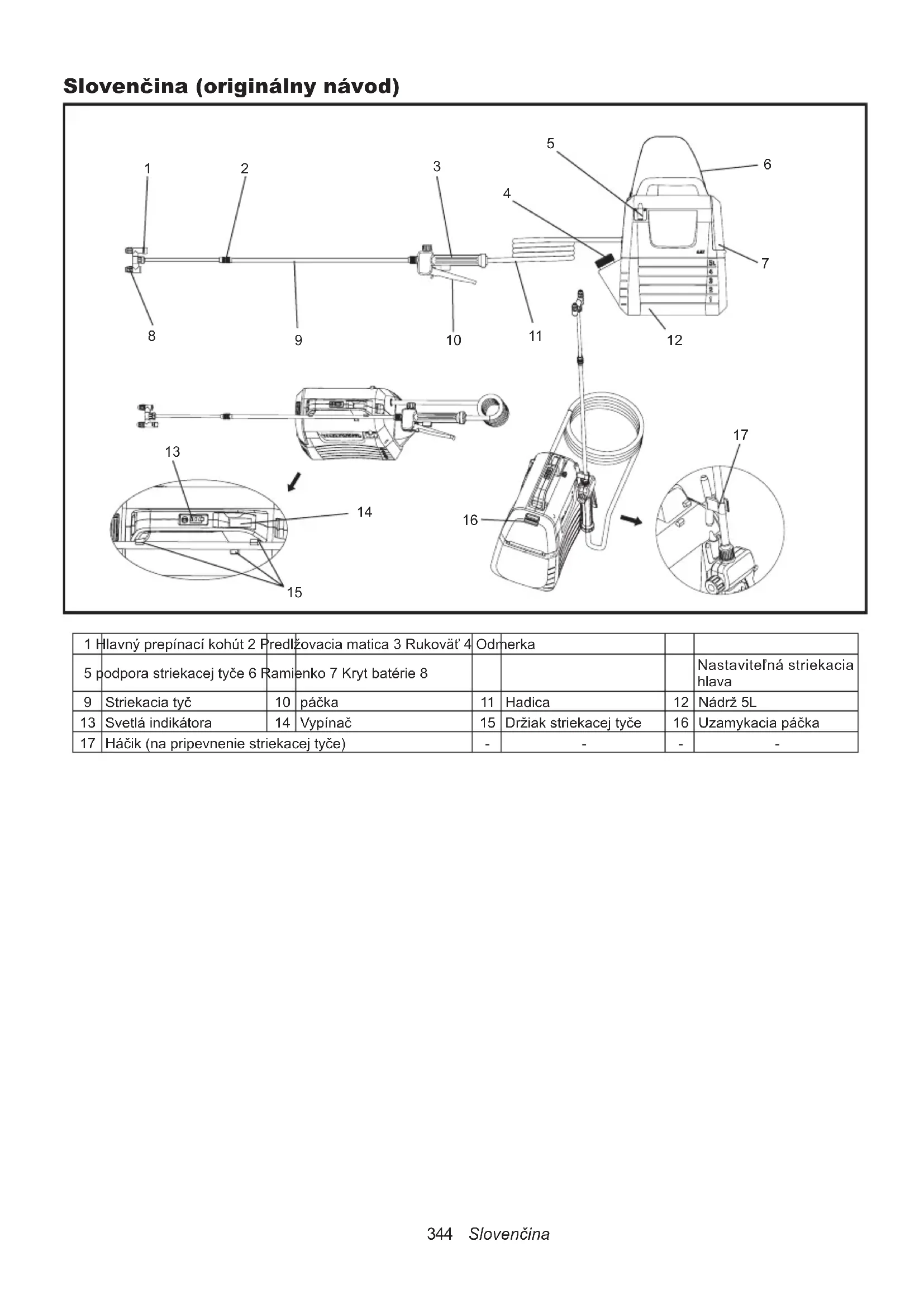 Li-ion Len pre štáty EÚ Z dôvodu prítomnosti nebezpečných komponentov v zariadení môžu mať odpad z elektrických a elektronických zariadení, použité akumulátory a batérie negatívny vplyv na životné prostredie a ľudské zdravie. Elektrické a elektronické zariadenia alebo akumulátory nelikvidujte spolu s komunálnym odpadom! V súlade s európskou smernicou o odpade z elektrických a elektronických zariadení, o akumulátoroch a batériách a odpade z akumulátorov a batérií, ako aj v súlade s prispôsobenými vnútroštát- nymi právnymi predpismi by sa odpad z elektrických a elektronických zariadení a použité akumulátory a batérie mali uskladňovať osobitne a odovzdávať na samostatnom zbernom mieste pre komunálny odpad, ktoré sa prevádzkuje v súlade s predpismi na ochranu život- ného prostredia. Označuje to symbol preškrtnutej smetnej nádoby na zariadení. Noste dýchaciu masku. Noste ochranné okuliare. Noste bezpečnostnú obuv. Noste ochranné rukavice. Nepoužívajte v daždi ani nenechajte postrekovač vonku počas dažďa. Prečítajte si návod na použitie. Pri striekaní udržujte osoby ďaleko346 Slovenčina Predpokladané použitie Toto zariadenie je určené na striekanie. Hluk Typická hladina hluku vážená A stanovená podľa EN62841-1:Úroveň akustického tlaku (L ): 70 dB (A) alebo menejOdchýlka (K): 3 dB (A)POZN.: Deklarované hodnoty emisií hluku boli name-rané v súlade so štandardnou skúšobnou metódou a môžu sa použiť na porovnanie jedného náradia s druhým.POZN.: Deklarované hodnoty emisií hluku možno použiť aj pri predbežnom hodnotení expozície.UPOZORNENIE: Noste ochranu sluchu. UPOZORNENIE: Emisia hluku pri skutoč- nom použití elektrického náradia sa môže líšiť od deklarovaných hodnôt v závislosti od spôsobov, ako sa elektrické náradie používa, najmä od druhu obrobku. UPOZORNENIE: Určite bezpečnostné opat- renia na ochranu obsluhy, ktoré vychádzajú z odhadu expozície v skutočných podmienkach používania (zvážte všetky prvky prevádzkového cyklu, ako sú časy, keď je náradie vypnuté a keď beží naprázdno okrem času spustenia). Vibrácie Celková hodnota vibrácií (trojosový vektorový súčet) určená podľa štandardu EN62841-1: Režim činnosti: prevádzka bez záťaže Emisie vibrácií (a ) : 2,5 m/s alebo menej Odchýlka (K): 1,5 m/s POZN.: Deklarované celkové hodnoty vibrácií boli namerané v súlade so štandardnou skúšobnou metó-dou a môžu sa použiť na porovnanie jedného nástroja s druhým.POZN.: Deklarované celkové hodnoty vibrácií sa môžu použiť aj pri predbežnom hodnotení expozície. UPOZORNENIE: Emisia vibrácií pri skutoč- nom použití elektrického náradia sa môže líšiť od deklarovaných hodnôt v závislosti od spôsobov, ako sa elektrické náradie používa, najmä od druhu obrobku. UPOZORNENIE: Určite bezpečnostné opat- renia na ochranu obsluhy, ktoré vychádzajú z odhadu expozície v skutočných podmienkach používania (zvážte všetky prvky prevádzkového cyklu, ako sú časy, keď je náradie vypnuté a keď beží naprázdno okrem času spustenia). ES Vyhlásenie o zhode Iba pre európske krajinyES Vyhlásenie o zhode je obsiahnuté v prílohe A k tomuto návodu na obsluhu. UPOZORNENIE Toto zariadenie môže používať deti vo veku od 8 rokov a osoby so zníženými fyzickými, zmys- lovými alebo duševnými schop- nosťami alebo s nedostatkom skúseností a znalostí, ak sú pod dozorom alebo poučením o bez- pečnom používaní zariadenia a rozumejú súvisiacim nebez- pečenstvám. Deti sa so zaria- dením nesmú hrať. Čistenie a údržbu nesmú vykonávať deti bez dozoru. Všeobecné bezpečnostné pokyny pre elektrické náradie UPOZORNENIE: Prečítajte si všetky bezpeč- nostné varovania, pokyny, ilustrácie a technické údaje dodávané s týmto elektrickým náradím. Nedodržanie všetkých nižšie uvedených pokynov môže mať za následok úraz elektrickým prúdom, požiar alebo vážne zranenie. Uchovajte si všetky upozor- nenia a pokyny pre potrebu v budúcnosti. Pojem „elektrické náradie“ vo varovaniach sa týka vášho elektrického náradia napájaného zo siete (s káblom) alebo z batérie (bez kábla).Bezpečnosť pracovného priestoru1. Udržujte pracovný priestor čistý a dobre osvet-lený. Neporiadok alebo tma môže viesť k nehodám.2. Nepoužívajte elektrické náradie vo výbušnom prostredí, napríklad v prostredí s horľavými kvapalinami, plynmi alebo prachom. Elektrické náradie vytvára iskry, ktoré môžu zapáliť prach alebo výpary.3. Pri práci s elektrickým náradím držte prosím deti a okoloidúcich v dostatočnej vzdialenosti. Rozptýlenie môže spôsobiť, že stratíte kontrolu.347 Slovenčina Elektrická bezpečnosť
