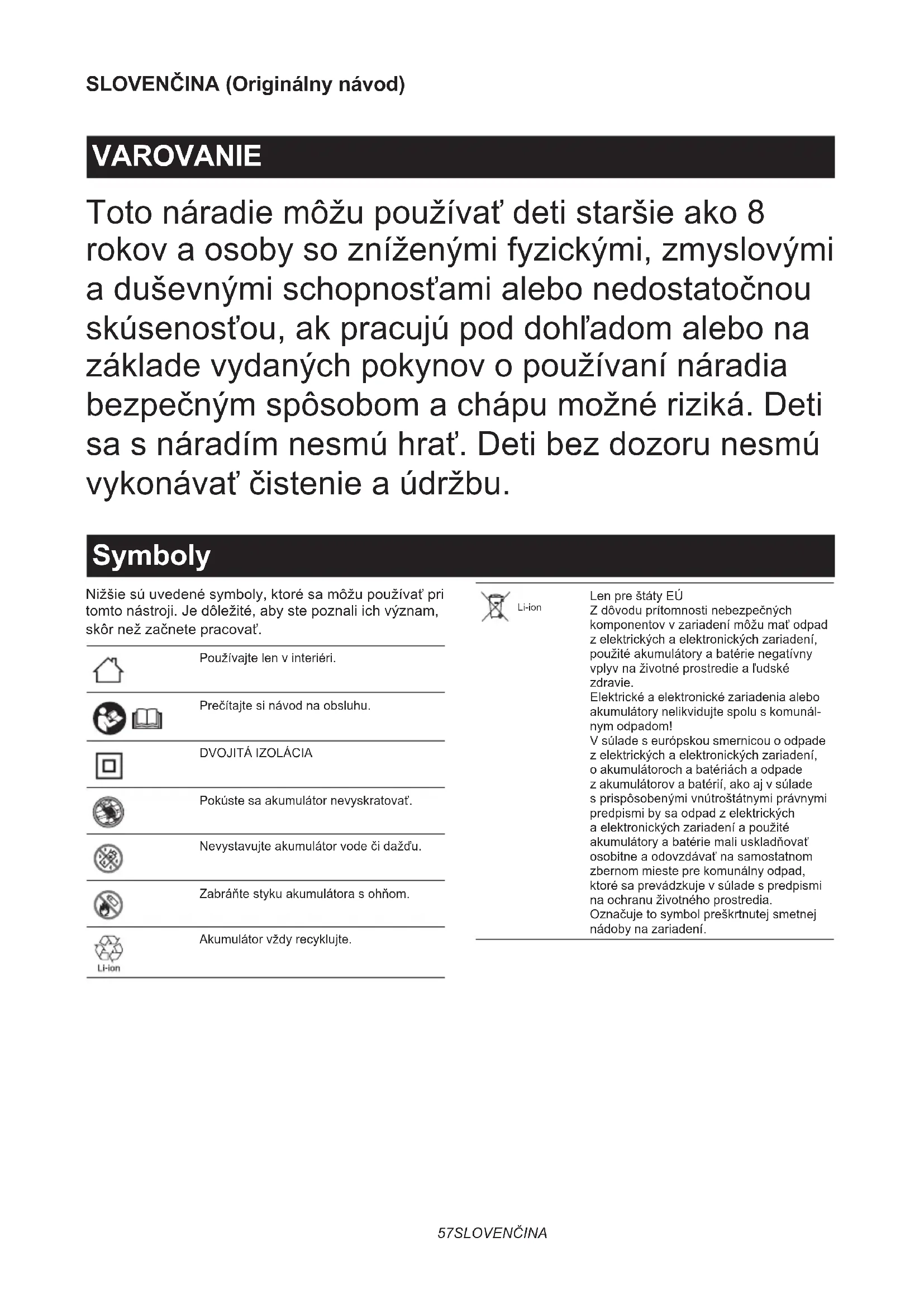 čítajte všetky pokyny a výstražné označenia na (1) nabíjačke akumulátorov, (2) akumulátore a (3) produkte používajúcom akumulátor.