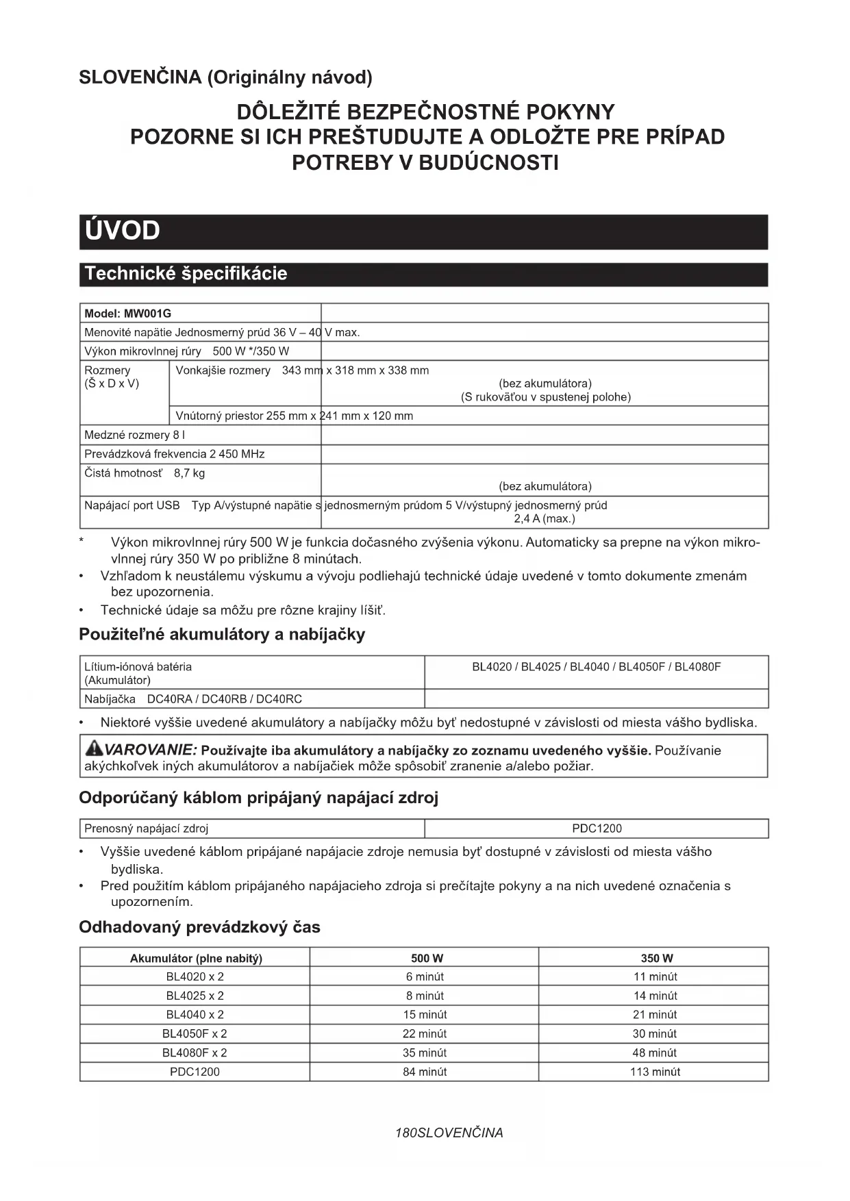 - Výkonmikrovlnnejrúry500Wjefunkciadočasnéhozvýšeniavýkonu.Automatickysaprepnenavýkonmikro- vlnnejrúry350Wpopribližne8minútach.• Vzhľadomkneustálemuvýskumuavývojupodliehajútechnickéúdajeuvedenévtomtodokumentezmenámbez upozornenia.• Technickéúdajesamôžuprerôznekrajinylíšiť. Použiteľné akumulátory a nabíjačky Lítium-iónová batéria(Akumulátor)BL4020 / BL4025 / BL4040 / BL4050F / BL4080FNabíjačka DC40RA / DC40RB / DC40RC• Niektorévyššieuvedenéakumulátoryanabíjačkymôžubyťnedostupnévzávislostiodmiestavášhobydliska. VAROVANIE: Používajte iba akumulátory a nabíjačky zo zoznamu uvedeného vyššie.Používanie akýchkoľvekinýchakumulátorovanabíjačiekmôžespôsobiťzraneniea/alebopožiar. Odporúčaný káblom pripájaný napájací zdroj Prenosnýnapájacízdroj PDC1200• Vyššieuvedenékáblompripájanénapájaciezdrojenemusiabyťdostupnévzávislostiodmiestavášhobydliska.• Predpoužitímkáblompripájanéhonapájaciehozdrojasiprečítajtepokynyananichuvedenéoznačeniasupozornením. Odhadovaný prevádzkový čas Akumulátor (plne nabitý) 500 W 350 WBL4020 x 2 6 minút 11 minútBL4025 x 2 8 minút 14 minútBL4040 x 2 15 minút 21 minútBL4050F x 2 22 minút 30 minútBL4080F x 2 35 minút 48 minútPDC1200 84 minút 113 minút181 SLOVENČINA POZNÁMKA:Hodnotysúlenpribližnéamôžusalíšiťvzávislostiodstavunabíjaniaapodmienokpoužitia. POZNÁMKA:Odhadovanýprevádzkovýčassjednýmakumulátoromjepribližnepolovicačasupripoužitídvoch akumulátorov. Určené použitie Tentospotrebičjeurčenýnaohrievaniejedla. Dôležité bezpečnostné prvky VAROVANIE: Servis tohto spotrebiča smie vykoná- vať len kvalikovaný servisný personál. Na účely kontroly, opravy alebo nastavenia sa obráťte na najbližšie autorizované servisné stredisko. VAROVANIE: Nepokúšajte sa tento spotrebič pou- žívať s otvorenými dvierkami, pretože prevádzka s otvorenými dvierkami môže predstavovať riziko nebezpečnej expozícii mikrovlnnej energii. VAROVANIE: Ak sú dvierka (odklonené), pánty (poškodené alebo uvoľnené), tesnenia dvierok alebo povrch tesnení poškodené, nesmie sa mik- rovlnná rúra používať, kým ju neopraví vyškolená osoba. VAROVANIE: Pre každého s výnimkou vyškolenej osoby je nebezpečné vykonávať akýkoľvek servis alebo opravu vrátane odstránenia akéhokoľvek krytu, ktorý poskytuje ochranu pred vystavením sa mikrovlnnej energii. VAROVANIE: Spotrebič používajte len na jeho určené použitie podľa popisu v tomto návode. VAROVANIE: Nepoužívajte v tomto spotrebiči koro- zívne chemikálie alebo výpary. VAROVANIE: Tento typ spotrebiča je špeciálne navrhnutý na ohrievanie a varenie jedál alebo suše- nie potravín. Nie je určený na priemyselné alebo laboratórne použitie. VAROVANIE: Tekutiny alebo iné potraviny sa nesmú zohrievať v uzavretých nádobách, pretože hrozí výbuch.
