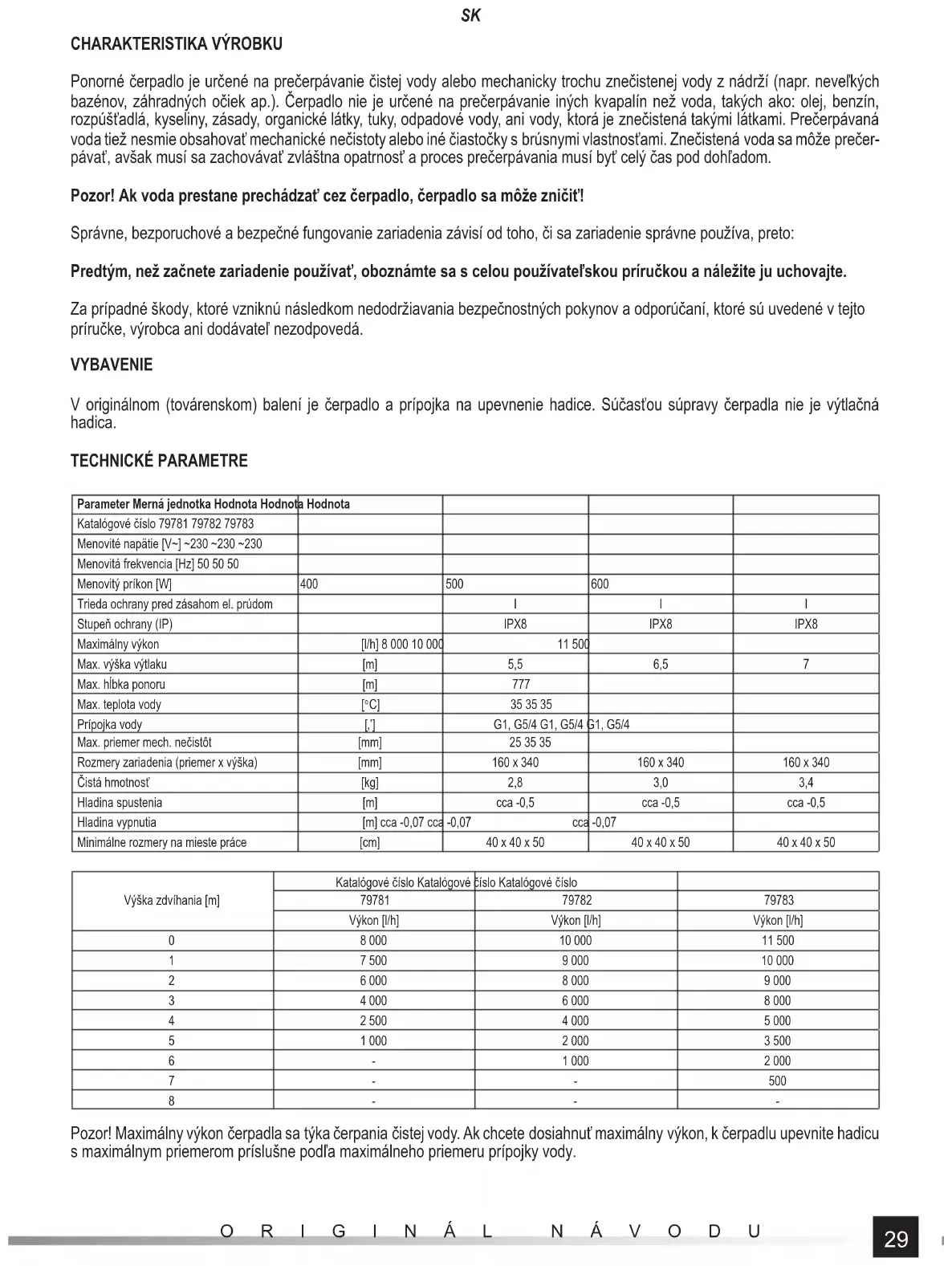Ponorné čerpadlo je určené na prečerpávanie čistej vody alebo mechanicky trochu znečistenej vody z nádrží (napr. neveľkých bazénov, záhradných očiek ap.). Čerpadlo nie je určené na prečerpávanie iných kvapalín než voda, takých ako: olej, benzín, rozpúšťadlá, kyseliny, zásady, organické látky, tuky, odpadové vody, ani vody, ktorá je znečistená takými látkami. Prečerpávaná voda tiež nesmie obsahovať mechanické nečistoty alebo iné čiastočky s brúsnymi vlastnosťami. Znečistená voda sa môže prečer- pávať, avšak musí sa zachovávať zvláštna opatrnosť a proces prečerpávania musí byť celý čas pod dohľadom. Pozor! Ak voda prestane prechádzať cez čerpadlo, čerpadlo sa môže zničiť! Správne, bezporuchové a bezpečné fungovanie zariadenia závisí od toho, či sa zariadenie správne používa, preto: Predtým, než začnete zariadenie používať, oboznámte sa s celou používateľskou príručkou a náležite ju uchovajte. Za prípadné škody, ktoré vzniknú následkom nedodržiavania bezpečnostných pokynov a odporúčaní, ktoré sú uvedené v tejto príručke, výrobca ani dodávateľ nezodpovedá. VYBAVENIE V originálnom (továrenskom) balení je čerpadlo a prípojka na upevnenie hadice. Súčasťou súpravy čerpadla nie je výtlačná hadica. TECHNICKÉ PARAMETRE Parameter Merná jednotka Hodnota Hodnota Hodnota Katalógové číslo 79781 79782 79783 Menovité napätie [V~] ~230 ~230 ~230 Menovitá frekvencia [Hz] 50 50 50 Menovitý príkon [W] 400 500 600 Trieda ochrany pred zásahom el. prúdom I I I Stupeň ochrany (IP) IPX8 IPX8 IPX8 Maximálny výkon [l/h] 8 000 10 000 11 500 Max. výška výtlaku [m] 5,5 6,5 7 Max. hĺbka ponoru [m] 777 Max. teplota vody [