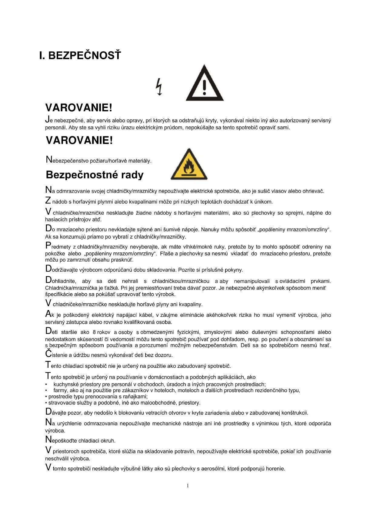 VAROVANIE! Je nebezpečné, aby servis alebo opravy, pri ktorých sa odstraňujú kryty, vykonával niekto iný ako autorizovaný servisný personál. Aby ste sa vyhli riziku úrazu elektrickým prúdom, nepokúšajte sa tento spotrebič opraviť sami. VAROVANIE! Nebezpečenstvo požiaru/horľavé materiály. Bezpečnostné rady Na odmrazovanie svojej chladničky/mrazničky nepoužívajte elektrické spotrebiče, ako je sušič vlasov alebo ohrievač. Z nádob s horľavými plynmi alebo kvapalinami môže pri nízkych teplotách dochádzať k únikom. V chladničke/mrazničke neskladujte žiadne nádoby s horľavými materiálmi, ako sú plechovky so sprejmi, náplne do hasiacich prístrojov atď. Do mraziaceho priestoru nevkladajte sýtené ani šumivé nápoje. Nanuky môžu spôsobiť „popáleniny mrazom/omrzliny“. Ak sa konzumujú priamo po vybratí z chladničky/mrazničky. Predmety z chladničky/mrazničky nevyberajte, ak máte vlhké/mokré ruky, pretože by to mohlo spôsobiť odreniny na pokožke alebo „popáleniny mrazom/omrzliny“. Fľaše a plechovky sa nesmú vkladať do mraziaceho priestoru, pretože môžu po zamrznutí obsahu prasknúť. Dodržiavajte výrobcom odporúčanú dobu skladovania. Pozrite si príslušné pokyny. Dohliadnite, aby sa deti nehrali s chladničkou/mrazničkou a aby nemanipulovali s ovládacími prvkami. Chladnička/mraznička je ťažká. Pri jej premiestňovaní treba dávať pozor. Je nebezpečné akýmkoľvek spôsobom meniť špecifikácie alebo sa pokúšať upravovať tento výrobok. V chladničeke/mrazničke neskladujte horľavé plyny ani kvapaliny. Ak je poškodený elektrický napájací kábel, v záujme eliminácie akéhokoľvek rizika ho musí vymeniť výrobca, jeho servisný zástupca alebo rovnako kvalifikovaná osoba. Deti staršie ako 8 rokov a osoby s obmedzenými fyzickými, zmyslovými alebo duševnými schopnosťami alebo nedostatkom skúseností či vedomostí môžu tento spotrebič používať pod dohľadom, resp. po poučení a oboznámení sa s bezpečným spôsobom používania a porozumení možným nebezpečenstvám. Deti sa so spotrebičom nesmú hrať. Čistenie a údržbu nesmú vykonávať deti bez dozoru. Tento chladiaci spotrebič nie je určený na použitie ako zabudovaný spotrebič. Tento spotrebič je určený na používanie v domácnostiach a podobných aplikáciách, ako