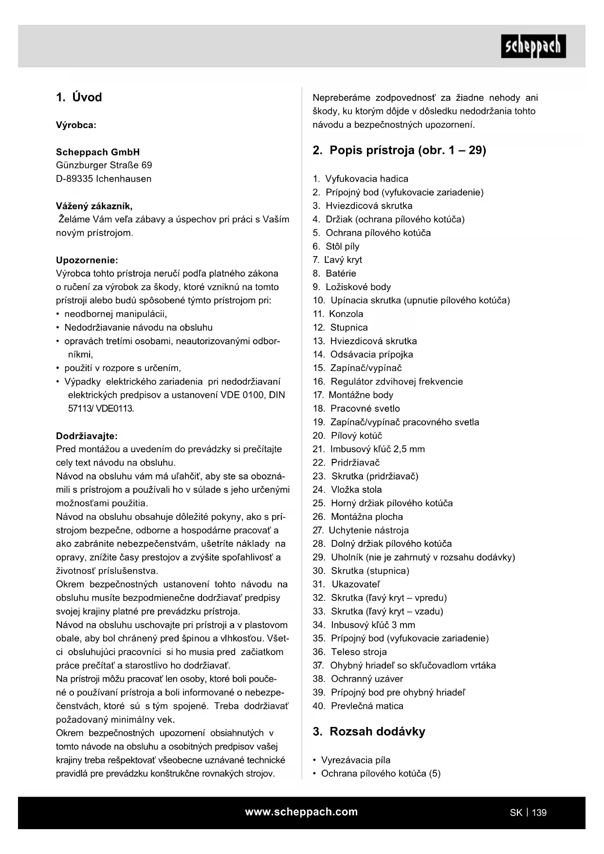 Výrobca: Scheppach GmbH Günzburger Straße 69 D-89335 Ichenhausen Vážený zákazník, Želáme Vám veľa zábavy a úspechov pri práci s Vaším novým prístrojom. Upozornenie: Výrobca tohto prístroja neručí podľa platného zákona o ručení za výrobok za škody, ktoré vzniknú na tomto prístroji alebo budú spôsobené týmto prístrojom pri: