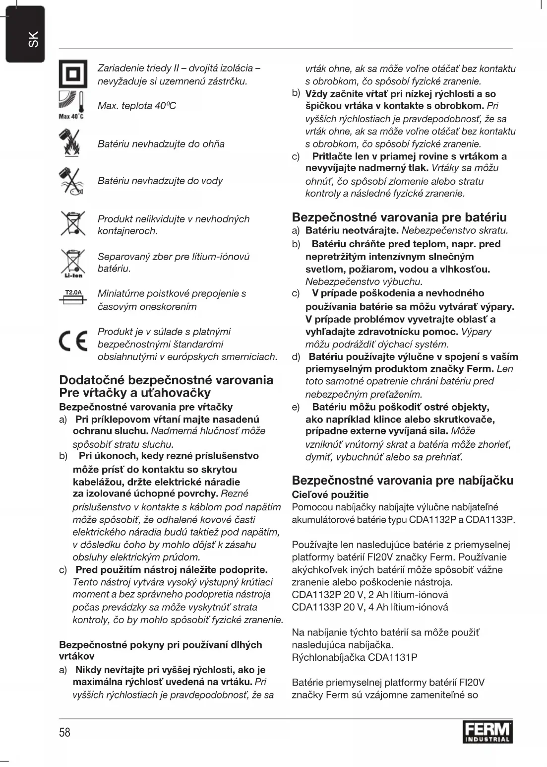 Vždy začnite vŕtať pri nízkej rýchlosti a so špičkou vrtáka v kontakte s obrobkom. Pri vyšších rýchlostiach je pravdepodobnosť, že sa vrták ohne, ak sa môže voľne otáčať bez kontaktu s obrobkom, čo spôsobí fyzické zranenie. c) Pritlačte len v priamej rovine s vrtákom a nevyvíjajte nadmerný tlak. Vrtáky sa môžu ohnúť, čo spôsobí zlomenie alebo stratu kontroly a následné fyzické zranenie. Bezpečnostné varovania pre batériu a) Batériu neotvárajte. Nebezpečenstvo skratu. b) Batériu chráňte pred teplom, napr. pred nepretržitým intenzívnym slnečným svetlom, požiarom, vodou a vlhkosťou. Nebezpečenstvo výbuchu. c) V prípade poškodenia a nevhodného používania batérie sa môžu vytvárať výpary. V prípade problémov vyvetrajte oblasť a vyhľadajte zdravotnícku pomoc. Výpary môžu podráždiť dýchací systém. d) Batériu používajte výlučne v spojení s vaším priemyselným produktom značky Ferm. Len toto samotné opatrenie chráni batériu pred nebezpečným preťažením. e) Batériu môžu poškodiť ostré objekty, ako napríklad klince alebo skrutkovače, prípadne externe vyvíjaná sila. Môže vzniknúť vnútorný skrat a batéria môže zhorieť, dymiť, vybuchnúť alebo sa prehriať. Bezpečnostné varovania pre nabíjačku Cieľové použitie Pomocou nabíjačky nabíjajte výlučne nabíjateľné akumulátorové batérie typu CDA1132P a CDA1133P. Používajte len nasledujúce batérie z priemyselnej platformy batérií FI20V značky Ferm. Používanie akýchkoľvek iných batérií môže spôsobiť vážne zranenie alebo poškodenie nástroja. CDA1132P 20 V, 2 Ah lítium-iónová CDA1133P 20 V, 4 Ah lítium-iónová Na nabíjanie týchto batérií sa môže použiť nasledujúca nabíjačka. Rýchlonabíjačka CDA1131P Batérie priemyselnej platformy batérií FI20V značky Ferm sú vzájomne zameniteľné so59