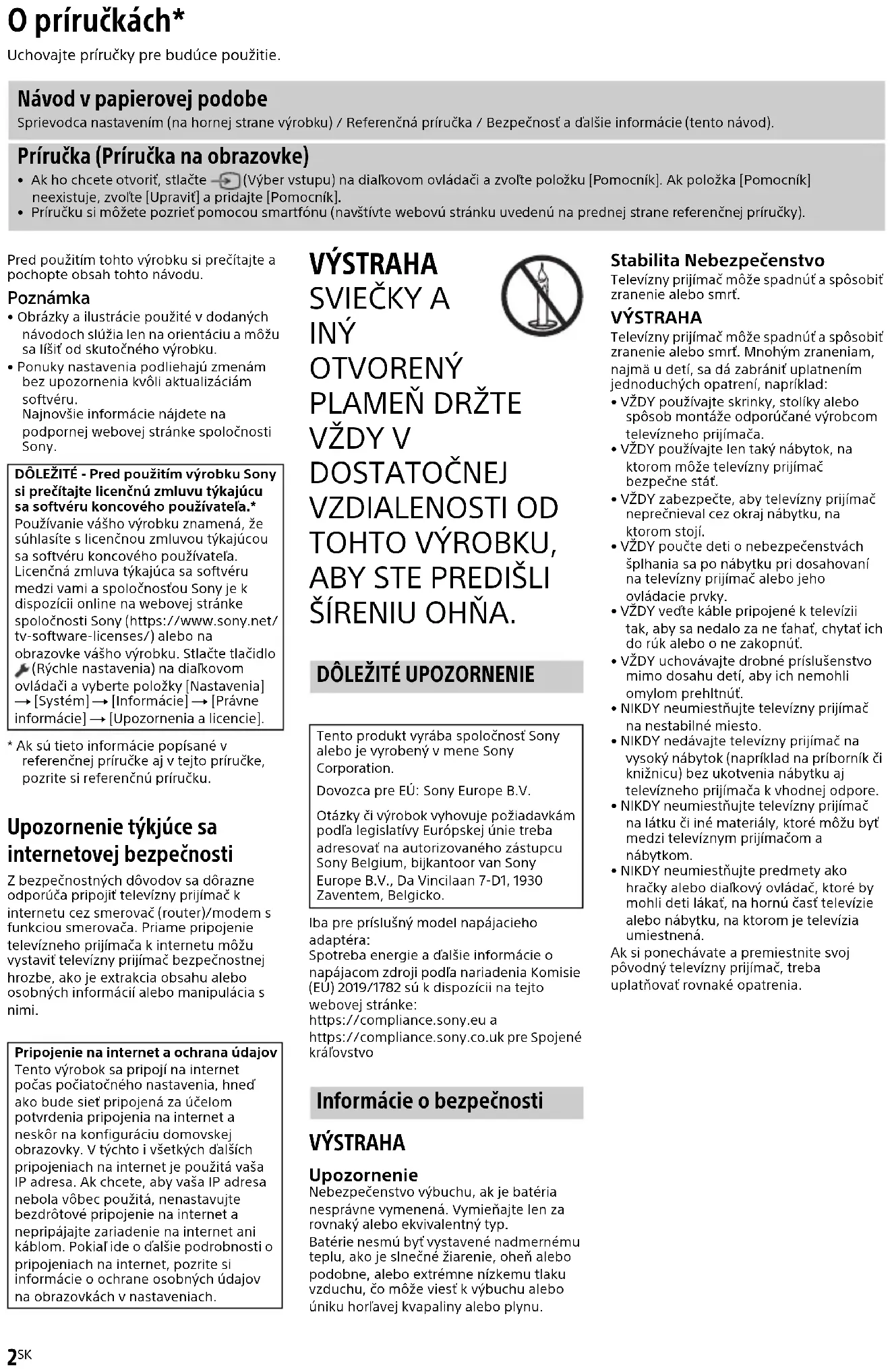 ŠÍRENIU OHŇA. Iba pre príslušný model napájacieho adaptéra:Spotreba energie a ďalšie informácie o napájacom zdroji podľa nariadenia Komisie (EÚ) 2019/1782 sú k dispozícii na tejto webovej stránke:https://compliance.sony.eu ahttps://compliance.sony.co.uk pre Spojené kráľovstvo VÝSTRAHA Upozornenie Nebezpečenstvo výbuchu, ak je batéria nesprávne vymenená. Vymieňajte len za rovnaký alebo ekvivalentný typ.Batérie nesmú byť vystavené nadmernému teplu, ako je slnečné žiarenie, oheň alebo podobne, alebo extrémne nízkemu tlaku vzduchu, čo môže viesť k výbuchu alebo úniku horľavej kvapaliny alebo plynu. Stabilita Nebezpečenstvo Televízny prijímač môže spadnúť a spôsobiť zranenie alebo smrť. VÝSTRAHA Televízny prijímač môže spadnúť a spôsobiť zranenie alebo smrť. Mnohým zraneniam, najmä u detí, sa dá zabrániť uplatnením jednoduchých opatrení, napríklad:• VŽDY používajte skrinky, stolíky alebo spôsob montáže odporúčané výrobcom televízneho prijímača.• VŽDY používajte len taký nábytok, na ktorom môže televízny prijímač bezpečne stáť.• VŽDY zabezpečte, aby televízny prijímač neprečnieval cez okraj nábytku, na ktorom stojí.• VŽDY poučte deti o nebezpečenstvách šplhania sa po nábytku pri dosahovaní na televízny prijímač alebo jeho ovládacie prvky.• VŽDY veďte káble pripojené k televízii tak, aby sa nedalo za ne ťahať, chytať ich do rúk alebo o ne zakopnúť.• VŽDY uchovávajte drobné príslušenstvo mimo dosahu detí, aby ich nemohli omylom prehltnúť.• NIKDY neumiestňujte televízny prijímač na nestabilné miesto.• NIKDY nedávajte televízny prijímač na vysoký nábytok (napríklad na príborník či knižnicu) bez ukotvenia nábytku aj televízneho prijímača k vhodnej odpore.• NIKDY neumiestňujte televízny prijímač na látku či iné materiály, ktoré môžu byť medzi televíznym prijímačom a nábytkom.• NIKDY neumiestňujte predmety ako hračky alebo diaľkový ovládač, ktoré by mohli deti lákať, na hornú časť televízie alebo nábytku, na ktorom je televízia umiestnená.Ak si ponechávate a premiestnite svoj pôvodný televízny prijímač, treba uplatňovať rovnaké opatrenia. O príručkách* Uchovajte príručky pre budúce použitie. Návod v papierovej podobe Sprievodca nastavením (na hornej strane výrobku) / Referenčná príručka / Bezpečnosť a ďalšie informácie (tento návod). Príručka (Príručka na obrazovke)