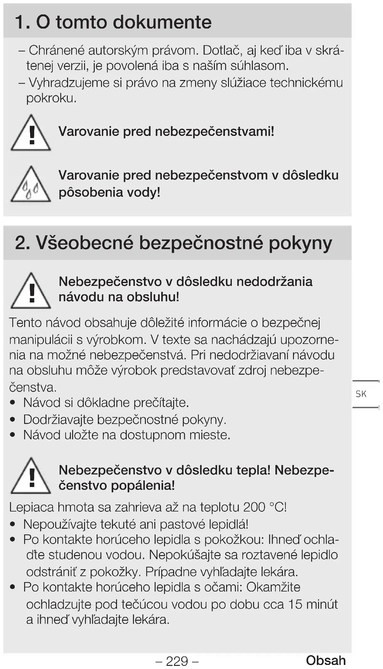 - Po kontakte horúceho lepidla s očami: Okamžite ochladzujte pod tečúcou vodou po dobu cca 15minút a ihneď vyhľadajte lekára.– 230 – Obsah