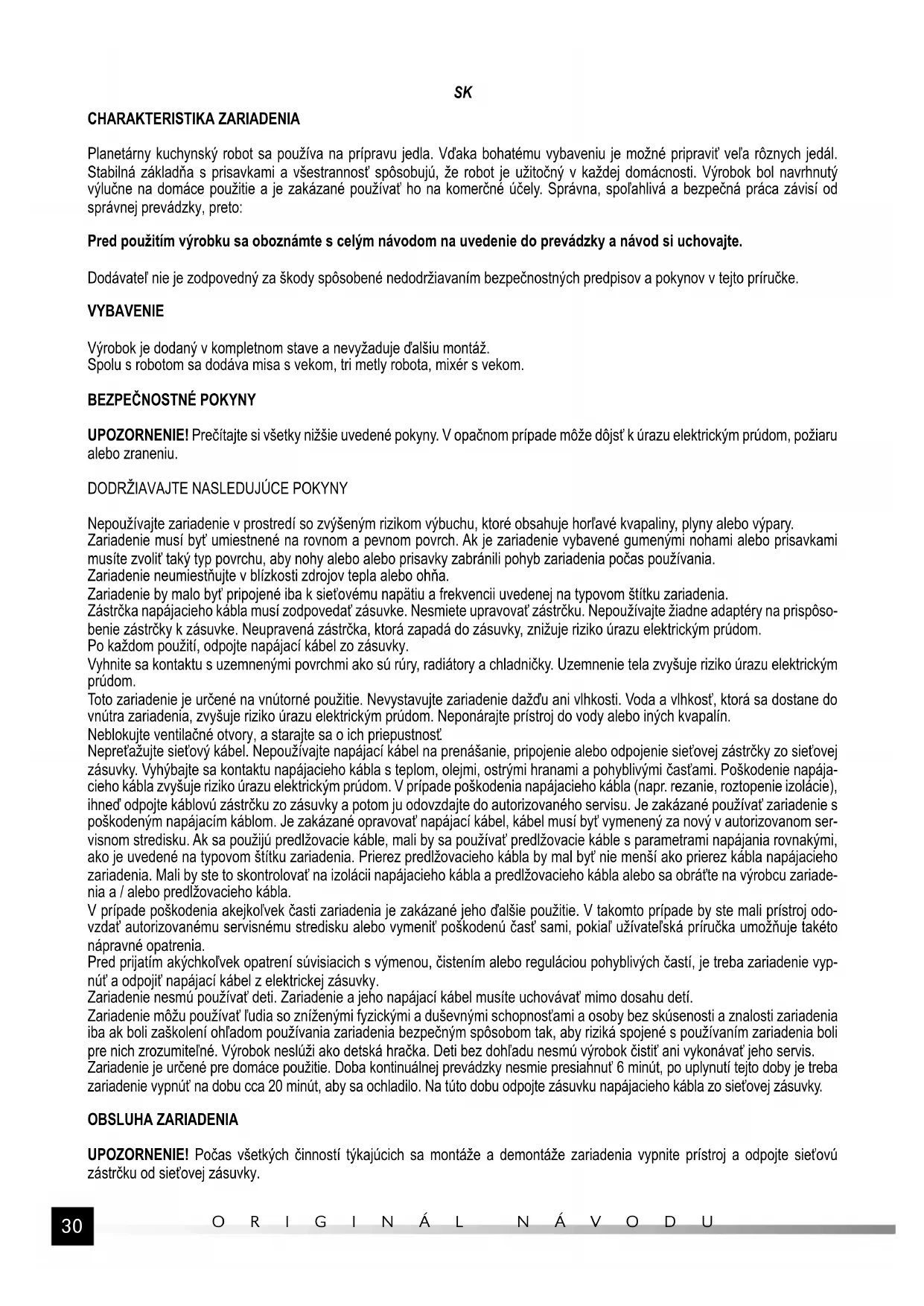 CHARAKTERISTIKA ZARIADENIA Planetárny kuchynský robot sa používa na prípravu jedla. Vďaka bohatému vybaveniu je možné pripraviť veľa rôznych jedál. Stabilná základňa s prisavkami a všestrannosť spôsobujú, že robot je užitočný v každej domácnosti. Výrobok bol navrhnutý výlučne na domáce použitie a je zakázané používať ho na komerčné účely. Správna, spoľahlivá a bezpečná práca závisí od správnej prevádzky, preto: Pred použitím výrobku sa oboznámte s celým návodom na uvedenie do prevádzky a návod si uchovajte. Dodávateľ nie je zodpovedný za škody spôsobené nedodržiavaním bezpečnostných predpisov a pokynov v tejto príručke. VYBAVENIE Výrobok je dodaný v kompletnom stave a nevyžaduje ďalšiu montáž. Spolu s robotom sa dodáva misa s vekom, tri metly robota, mixér s vekom.
