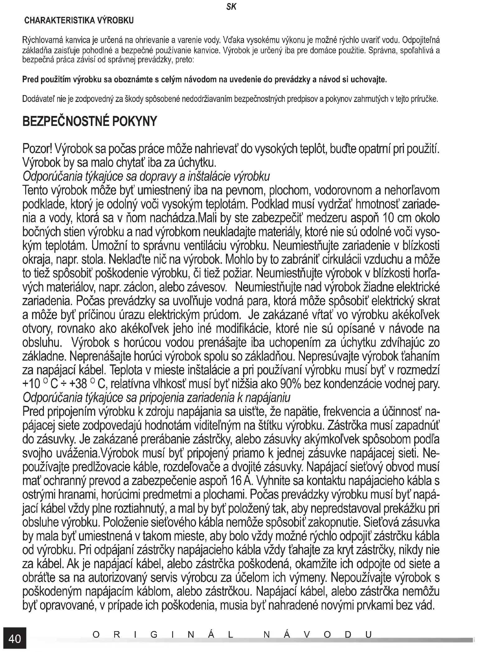 Odporúčania pre použitie výrobku Pozor! Výrobok je určený výlučne na ohrievanie a varenie vody. Je zakázané ho využívať na ohrievanie a varenie iných tekutín, ako voda. Používajte výrobok iba spolu s dodanou základňou. Počas použitia výrobku napájací kábel by mal byť úplne rozvinutý. Zvinutý pod základňou kábel sa môže prehriať a spôsobiť riziko vzniku požiaru a zásahu elektrickým prúdom. Uistite sa, že podlaha v blízkosti miesta použitia výrobku nie je klzká. Zabránite tým skĺznutiu, ktoré by mohlo spôsobiť vážne úrazy.Výrobok môže byť pripojený k zdroju napája- nia len počas práce. Po jej zakončení je potrebné odpojiť výrobok od napájania, vytiahnutím zástrčky zo zásuvky. Nenechávajte pripojený výrobok bez dozoru. Naplňujte výrobok vodou nalievajúc ju do kanvice. Nikdy neponárajte kanvicu do vody alebo inej tekutiny. Ak sa počas naplňovania kanvice voda rozleje na vonkajšiu časť kanvice alebo na základňu, dôkladne ju osušte pred pripojením kanvice k napájaniu. Vyhýbajte sa naplneniu ohriatej kanvice stude- nou vodou, môže to spôsobiť prasknutie skleného telesa kanvice v dôsledku nadmerných teplotných rozdielov. Nespúšťajte výrobok bez vody. Úroveň vody by mala vždy byť medzi ukazovateľmi minimálnej a maximálnej hladiny. Nižšia hladina vody by mohla poškodiť vý- robok alebo spôsobiť, že sa výrobok nespustí. Vyššia hladina vody môže spôsobiť rozlieva- nie vody počas varenia, čo môže byť príčinou vážnych popálenín.Upozornenie! Neotvárajte veko počas varenia vody.Počas používania kanvice vždy zatvárajte veko, inak sa spínač výrobku nespustí automatický. Neotvárajte veko kanvice hneď po uvarení vody. Pod ve- kom môže byť nahromadená skondenzovaná vodná para s vysokou teplotou. Kontakt s ňou môže viesť k popáleninám. Pozor! Veko umiest ňujte tak, aby vodná para vychádzala ďaleko od úchytky. Výrobok je určený na domáce použitie a je zakázané jeho používanie na komerčné účely, napr. v stravovacích zariadeniach.Je zakázané vykonávať samostatne opravy, demontáž, alebo modifi káciu výrobku. Všetky opravy výrobku musia byť vykonané v autorizovanom servise. Tento výrobok nemôžu používať detí do 8 rokov a osoby so zníže- nými fyzickými a mentálnymi schopnosťami, a osoby s nedostatkom skúseností a znalostí zariadenia. Je to povolené iba pod dohľadom, alebo po oboznámení sa s návodom, pokiaľ ide o používanie výrobku bezpečným spôsobom tak, aby si boli vedomé rizík spojených s prevádzkou zariadenia. Deti by sa nemali hrať s výrobkom. Deti bez dohľadu by nemali vykonávať čistenie a údržbu zariadenia. Nepoužívajte na čistenie výrobku agresívne látky, rozpúšťadlá, žieravé činidlá, alkohol, benzín alebo brusné prostriedky.