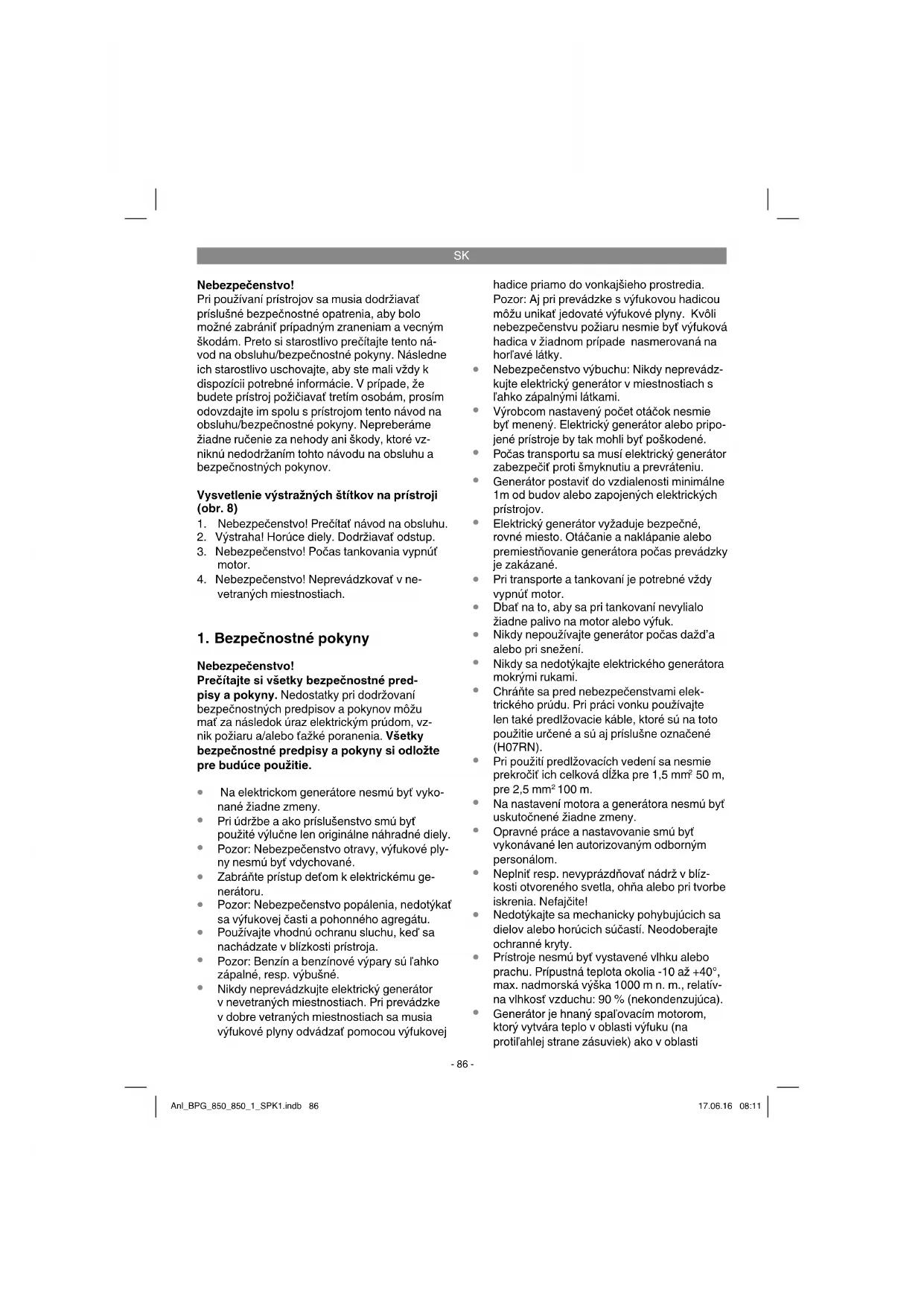 Generátor je hnaný spaľovacím motorom, ktorý vytvára teplo v oblasti výfuku (na protiľahlej strane zásuviek) ako v oblasti Anl_BPG_850_850_1_SPK1.indb 86Anl_BPG_850_850_1_SPK1.indb 86 17.06.16 08:1117.06.16 08:11SK