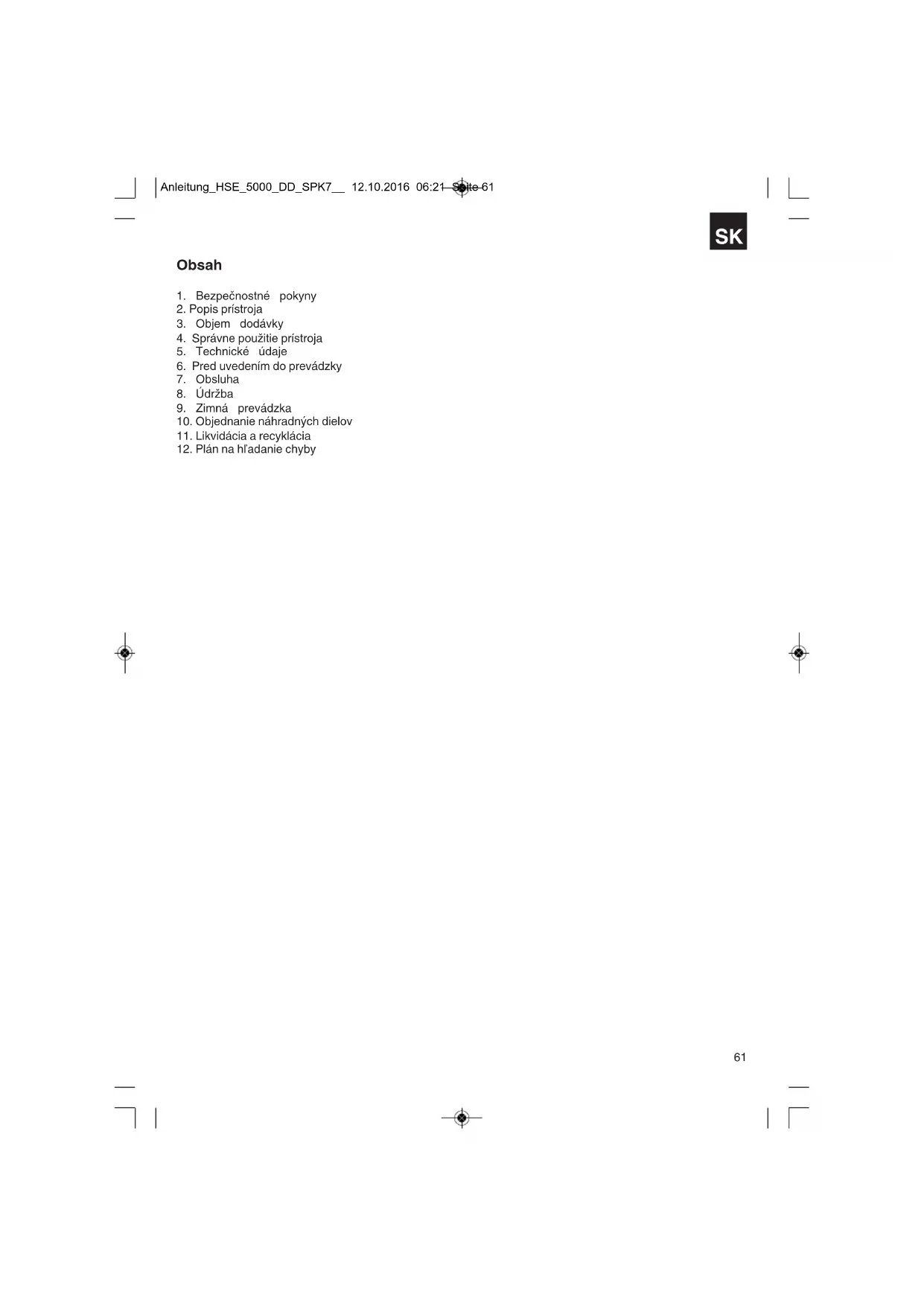 Prístroj sa nachádza v obale za účelom zabránenia poškodeniu pri transporte. Tento obal je vyrobený zo suroviny a tým pádom je ho možné znovu použiť alebo sa môže dať do zberu na recykláciu surovín. Prístroj a jeho príslušenstvo sa skladajú z rôznych materiálov, ako sú napr. kovy a plasty. Poškodené súčiastky odovzdajte na vhodnú likvidáciu špeciálneho odpadu. Informujte sa v odbornej predajni alebo na miestnych úradoch! Anleitung_HSE_5000_DD_SPK7__ 12.10.2016 06:21 Seite 66SK
