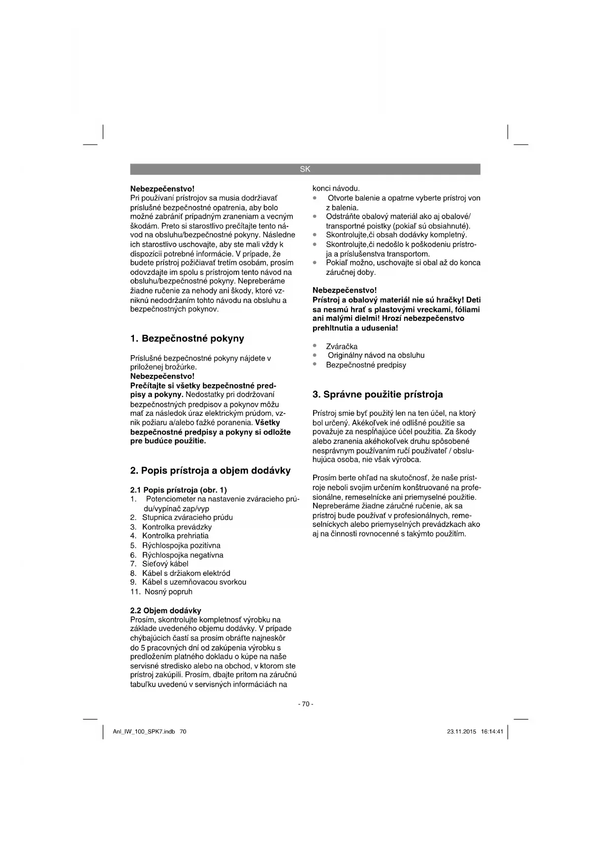 Prístroj smie byť použitý len na ten účel, na ktorý bol určený. Akékoľvek iné odlišné použitie sa považuje za nespĺňajúce účel použitia. Za škody alebo zranenia akéhokoľvek druhu spôsobené nesprávnym používaním ručí používateľ / obslu- hujúca osoba, nie však výrobca. Prosím berte ohľad na skutočnosť, že naše príst- roje neboli svojim určením konštruované na profe- sionálne, remeselnícke ani priemyselné použitie. Nepreberáme žiadne záručné ručenie, ak sa prístroj bude používať v profesionálnych, reme- selníckych alebo priemyselných prevádzkach ako aj na činnosti rovnocenné s takýmto použitím. Anl_IW_100_SPK7.indb 70Anl_IW_100_SPK7.indb 70 23.11.2015 16:14:4123.11.2015 16:14:41SK