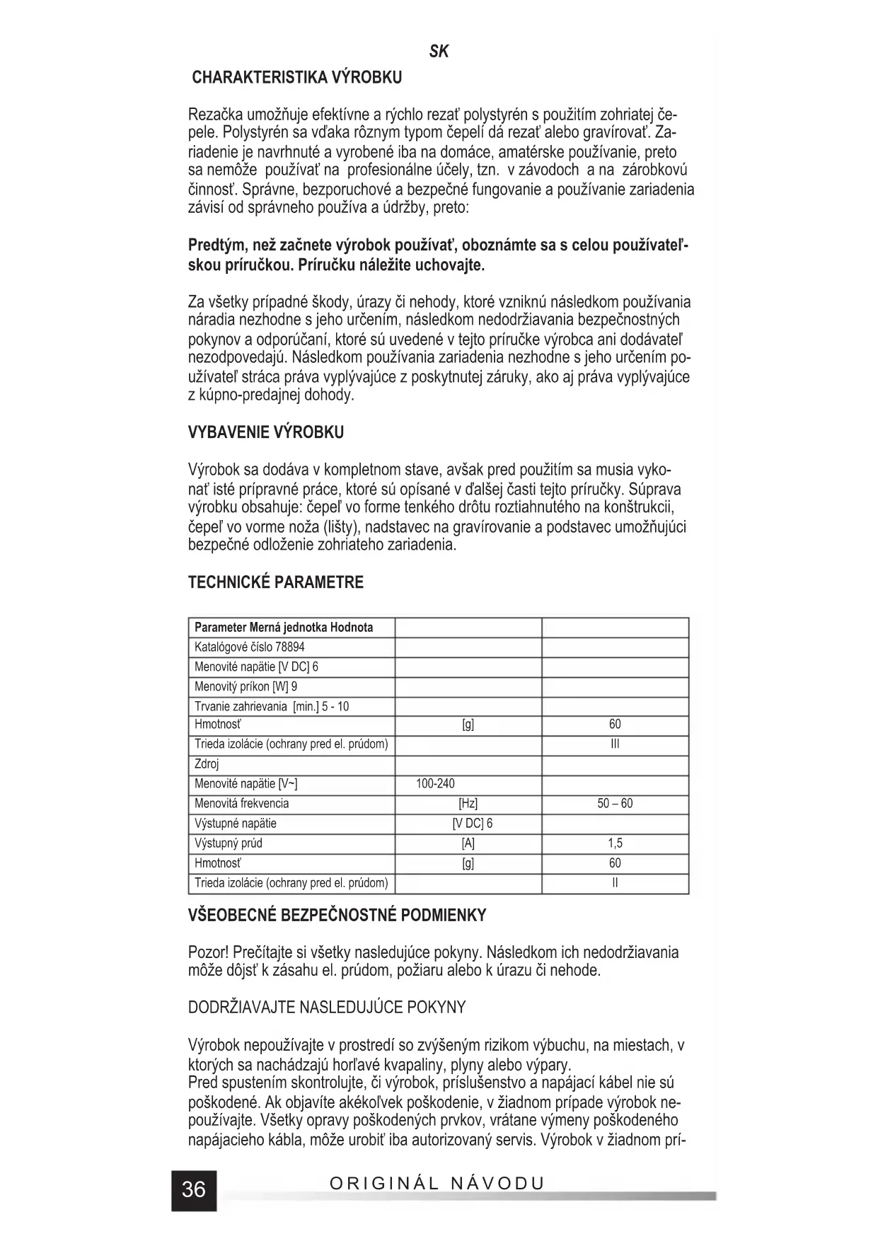 Výrobok sa dodáva v kompletnom stave, avšak pred použitím sa musia vyko- nať isté prípravné práce, ktoré sú opísané v ďalšej časti tejto príručky. Súprava výrobku obsahuje: čepeľ vo forme tenkého drôtu roztiahnutého na konštrukcii, čepeľ vo vorme noža (lišty), nadstavec na gravírovanie a podstavec umožňujúci bezpečné odloženie zohriateho zariadenia. TECHNICKÉ PARAMETRE Parameter Merná jednotka Hodnota Katalógové číslo 78894 Menovité napätie [V DC] 6 Menovitý príkon [W] 9 Trvanie zahrievania [min.] 5 - 10 Hmotnosť [g] 60 Trieda izolácie (ochrany pred el. prúdom) III Zdroj Menovité napätie [V~] 100-240 Menovitá frekvencia [Hz] 50 – 60 Výstupné napätie [V DC] 6 Výstupný prúd [A] 1,5 Hmotnosť [g] 60 Trieda izolácie (ochrany pred el. prúdom) II
