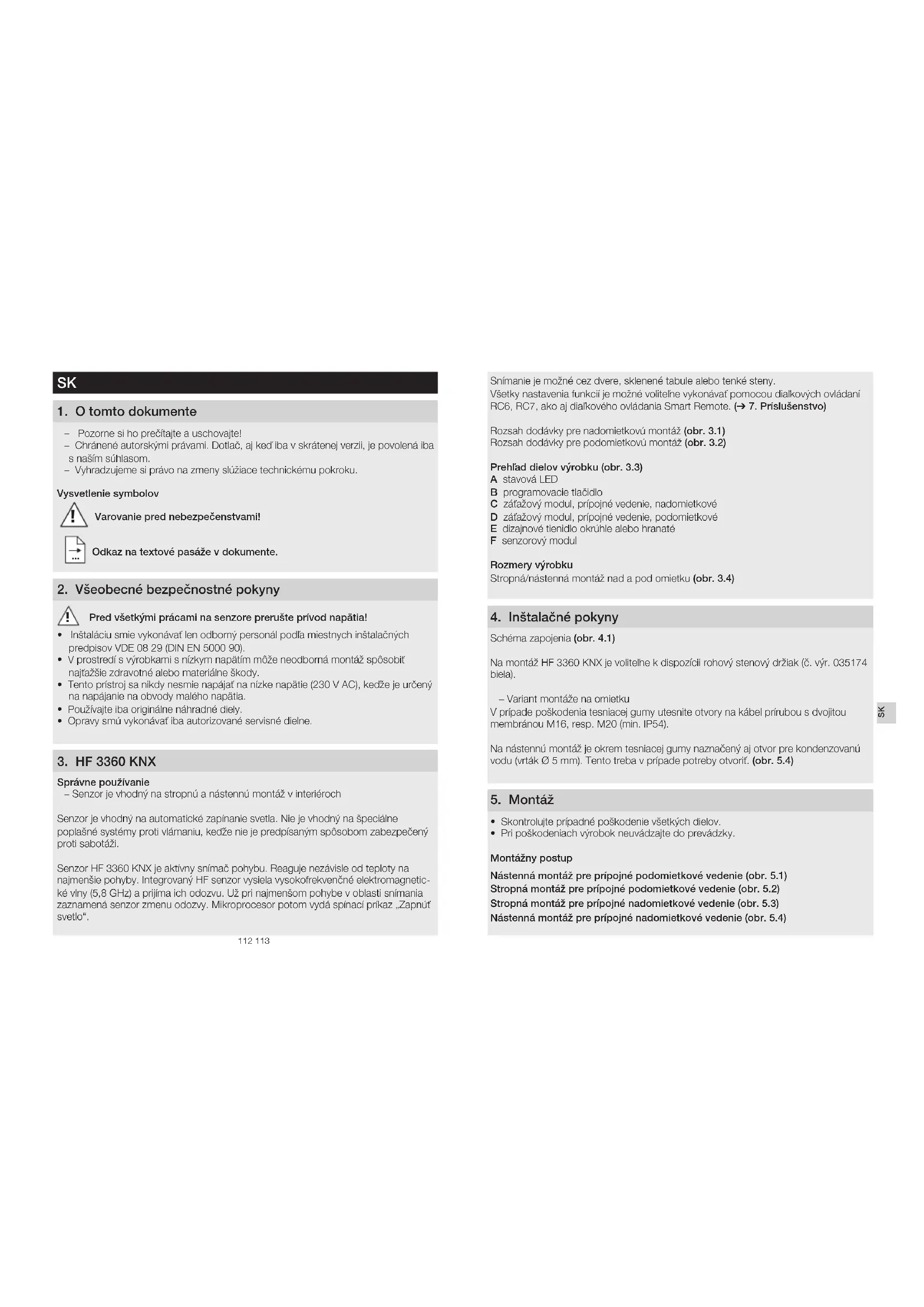 - Opravy smú vykonávať iba autorizované servisné dielne. 3 HF 3360 KNX Správne používanie – Senzor je vhodný na stropnú a nástennú montáž v interiéroch Senzor je vhodný na automatické zapínanie svetla. Nie je vhodný na špeciálne poplašné systémy proti vlámaniu, keďže nie je predpísaným spôsobom zabezpečený proti sabotáži. Senzor HF 3360 KNX je aktívny snímač pohybu. Reaguje nezávisle od teploty na najmenšie pohyby. Integrovaný HF senzor vysiela vysokofrekvenčné elektromagnetic- ké vlny (5,8GHz) a prijíma ich odozvu. Už pri najmenšom pohybe v oblasti snímania zaznamená senzor zmenu odozvy. Mikroprocesor potom vydá spínací príkaz „Zapnúť svetlo“.