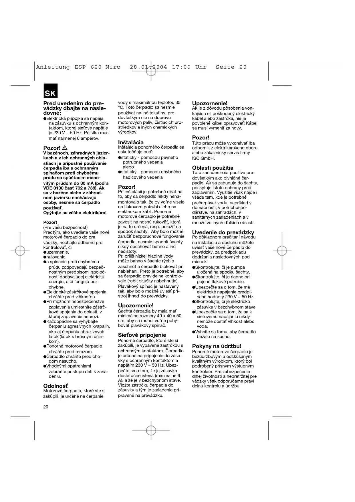 Altezza di mandata 7,5 m Profondità massima immersione 5 m Temperatura massima acqua 35°C gamento tubo 1 1/2” IG Corpi estranei fino a Ø 15 mm altezza del punto di commutazione: ACCESO 50 cmaltezza del punto di commutazione: SPENTO 5 cm N° dell’art. 41.705.09 Dati tecnici Prestazioni prevalenza portata 1m max.: 16.500 l/h 2m max.: 15.600 l/h 3m max.: 14.400 l/h 4m max.: 12.900 l/h 5m max.: 11.100 l/h 6m max.: 9.000 l/h Anleitung ESP 620_Niro 28.01.2004 17:06 Uhr Seite 19Pred uvedením do pre- vádzky dbajte na nasle- dovné: ● Elektrická prípojka sa napája na zásuvku s ochranným kon- taktom, ktorej sieťové napätie je 230 V ~ 50 Hz. Poistka musí mať najmenej 6 ampérov. Pozor! V bazénoch, záhradných jazier- kach a v ich ochranných obla- stiach je prípustné používanie čerpadla iba s ochranným spínačom proti chybnému prúdu so spúšťacím meno- vitým prúdom do 30 mA (podľa VDE 0100 časť 702 a 738). Ak sa v bazéne alebo v záhrad- nom jazierku nachádzajú osoby, nesmie sa čerpadlo používať. Opýtajte sa vášho elektrikára! Pozor! (Pre vašu bezpečnosť) Predtým, ako uvediete vaše nové motorové čerpadlo do pre vádzky, nechajte odborne pre kontrolovať, či ● uzemnenie, ● nulovanie, ● a spínanie proti chybnému prúdu zodpovedajú bezpeč- nostným predpisom spoloč- nosti dodávajúcej elektrickú energiu, a či fungujú bez- chybne. ● Elektrické zástrčkové spojenia chráňte pred vlhkosťou. ● Pri možnom nebezpečenstve zaplavenia umiestnite zástrč- kové spojenia do oblasti, v ktorej zaplavenie nehrozí. ● Každopádne sa vyhýbajte čerpaniu agresívnych kvapalín, ako aj čerpaniu abrazívnych látok (látok s brúsnym účin- kom). ● Ponorné motorové čerpadlo chráňte pred mrazom. ● Čerpadlo chráňte pred cho- dom nasucho. ● Vhodnými opatreniami zabráňte prístupu detí k zaria- deniu. Odolnosť Motorové čerpadlo, ktoré ste si zakúpili, je určené na čerpanie vody s maximálnou teplotou 35 °C. Toto čerpadlo sa nesmie používať na iné tekutiny, pre- dovšetkým nie na dopravu motorových palív, čistiacich pro- striedkov a iných chemických výrobkov! Inštalácia Inštalácia ponorného čerpadla sa uskutočňuje buď: ● staticky - pomocou pevného potrubného vedenia alebo ● staticky - pomocou ohybného hadicového vedenia Pozor! Pri inštalácii je potrebné dbať na to, aby sa čerpadlo nikdy nena- montovalo tak, že by voľne viselo na tlakovom potrubí alebo na elektrickom kábli. Ponorné motorové čerpadlo je potrebné zavesiť na nosnú rukoväť, ktorá je na to určená, resp. položiť na spodok šachty. Aby bolo možné zaručiť bezporuchové fungovanie čerpadla, nesmie spodok šachty nikdy obsahovať bahno a iné nečistoty. Pri príliš nízkej hladine vody môže bahno v šachte rýchlo zaschnúť a čerpadlo blokovať pri nabiehaní. Preto je potrebné, aby sa čerpadlo pravidelne kontrolo- valo (robiť skúšky nabehnutia). Plavákový spínač je nastavený tak, aby bolo možné uviesť prí- stroj ihneď do prevádzky. Upozornenie! Šachta čerpadla by mala mať minimálne rozmery 40 x 40 x 50 cm, aby sa mohol voľne pohy- bovať plavákový spínač. Sieťové pripojenie Ponorné čerpadlo, ktoré ste si zakúpili, je vybavené zástrčkou s ochranným kontaktom. Čerpadlo je určené na pripojenie do zásu- vky s ochranným kontaktom a napätím 230 V ~ 50 Hz. Ubez- pečte sa o tom, že je zásuvka dostatočne istená (minimálne 6 A), a že je v bezchybnom stave. Vložte zástrčku čerpadla do zásuvky a tým je zariadenie pri- pravené na prevádzku. Upozornenie! Ak je z dôvodu pôsobenia von- kajších síl poškodený elektrický kábel alebo zástrčka, nie je povolené kábel opravovať! Kábel sa musí vymeniť za nový. Pozor! Túto prácu môže vykonávať iba odborník z elektrikárskeho oboru alebo zákaznícky servis firmy ISC GmbH. Oblasti použitia Toto zariadenie sa používa pre- dovšetkým ako pivničné čer- padlo. Ak sa zabuduje do šachty, poskytuje istotu ochrany pred zaplavením. Využitie však nájde i všade tam, kde je potrebné prečerpávať vodu, napríklad v domácnosti, v poľnohospo- dárstve, na záhradách, v sanitárnych zariadeniach a v množstve iných ďalších oblastí. Uvedenie do prevádzky Po dôkladnom prečítaní návodu na inštaláciu a obsluhu môžete uviesť vaše nové čerpadlo do prevádzky, za predpokladu dodržania nasledovných pod- mienok: ● Skontrolujte, či je pumpa uložená na spodku šachty. ● Skontrolujte, či je riadne pri- pojené tlakové potrubie. ● Ubezpečte sa o tom, že má elektrické napájanie predpí- sané hodnoty 230 V ~ 50 Hz. ● Skontrolujte, či je elektrická zásuvka v bezchybnom stave. ● Ubezpečte sa o tom, že sa k sieťovému napájaniu nikdy nemôže dostať vlhkosť alebo voda. ● Vyhnite sa tomu, aby čerpadlo bežalo na sucho. Pokyny na údržbu! Ponorné motorové čerpadlo je bezúdržbovým a odskúšaným kvalitným výrobkom, ktorý bol podrobený prísnym výstupným kontrolám. Pre zabezpečenie dlhej životnosti a nepretržitej pre vádzky však odporúčame pravi delnú kontrolu a údržbu.