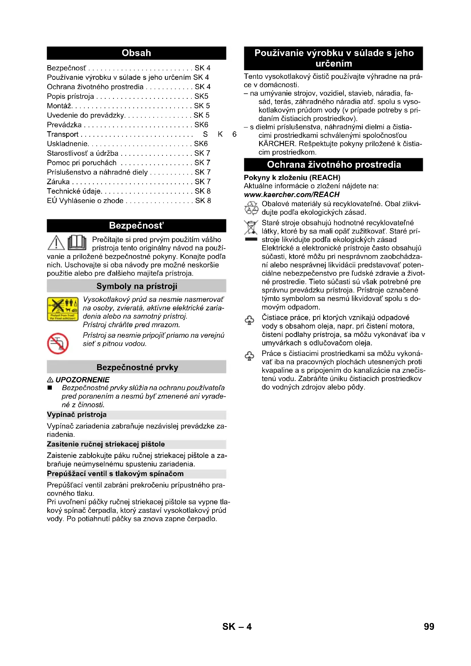 Uzavrite páku ručnej striekacej pištole. Zariadenie odpojte od vodovodnej prípojky. 몇 UPOZORNENIE Nebezpečenstvo zranenia a poškodenia! Pri prepravovaní prístroja zohľadnite jeho hmotnosť. Prístroj ťahajte za prepravnú rukoväť. Nádrž s čistiacim prostriedkom vyprázdnite. Prístroj zaistite proti zošmyknutiu a prevráteniu. 몇 UPOZORNENIE Nebezpečenstvo zranenia a poškodenia! Pri uskladnení prístroja zohľadnite jeho hmotnosť. Pred dlhším skladovaním, napr. v zime, dodatočne zo- hľadnite pokyny uvedené v kapitole Ošetrovanie. Prístroj postavte na rovnú plochu. Stlačte odpojovacie tlačidlo ručnej striekacej pišto- le a vysokotlakovú hadicu odpojte od ručnej strie- kacej pištole. Otáčaním ručnej kľuky oproti smeru pohybu hodi- nových ručičiek naviňte celú vysokotlakovú hadicu na hadicový bubon. Ručnú striekaciu pištoľ zasuňte do úložného prie- storu, ktorý je pre ňu vyhradený. Sieťový kábel a zvyšné príslušenstvo uložte do prí- stroja. POZOR Prístroje a príslušenstvo, ktoré nie sú úplne vyprázdne- né, môžu byť poškodené mrazom. Vyprázdnite úplne prístroj a príslušenstvo a chráňte ich pred mrazom. Aby ste zabránili vzniku škôd: Zariadenie odpojte od vodovodnej prípojky. Oddeľte prúdnicu od ručnej striekacej pištole. Prístroj zapnite (1/ZAP) a zatlačte páku ručnej striekacej pištole tak, že už viac nevystupuje žiad- na voda (asi 1 min). Prístroj vypnite. Zariadenie s kompletným príslušenstvom uscho- vajte na mieste chránenom pred mrazom. Prevádzka Prevádzka s vysokým tlakom Prevádzka s čistiacim prostriedkom Odporúčaný spôsob čistenia Prerušenie prevádzky Ukončenie prevádzky Transport Ručná preprava Preprava vo vozidlách Uskladnenie Uskladnenie prístroja Ochrana proti zamrznutiu 101SK– 7 NEBEZPEČENSTVO Nebezpečenstvo úderu elektrickým prúdom. Pred všetkými prácami prístroj vypnite a vytiahnite sieťovú zástrčku. Pravidelne čistite sitko vo vodnej prípojke. Odstráňte spojku vodnej prípojky. Obrázok POZOR Sitko sa nesmie poškodiť. Vytiahnite sitko plochými kliešťami. Vyčistite sitko pod tečúcou vodou. Nasaďte sitko späť do vodnej prípojky. Pred dlhším skladovaním, napr. v zime: Vytiahnite filter zo sacej hadice na čistiaci prostrie- dok a umyte ho pod tečúcou vodou. Pomocou nasledujúceho prehľadu možno ľahko odstrá- niť drobné poruchy. V prípade pochybností sa láskavo obráťte na autorizo- vanú servisnú službu. NEBEZPEČENSTVO Nebezpečenstvo úderu elektrickým prúdom. Pred všetkými prácami prístroj vypnite a vytiahnite sieťovú zástrčku. Potiahnutím páky ručnej striekacej pištole sa zaria- denie zapne. Skontrolujte, či napätie uvedené na výrobnom štít- ku súhlasí s napätím napájacieho zdroja. Skontrolujte, či nie je kábel elektrickej siete poško- dený. Skontrolujte nastavenie trysky. Skontrolujte zásobovanie vodou na dostatočné prepravované množstvo. Plochými kliešťami vytiahnite sitko z vodovodnej prípojky a umyte ho pod tečúcou vodou. Pred prevádzkou zariadenie odvzdušnite. Zariadenie zapnite bez pripojenej trysky a nechajte ho bežať dovtedy (max. 2 minúty), kým na pištoli nevyteká voda bez bublín. Zariadenie vypnite a opäť pripojte trysku. Vyčistite vysokotlakovú dýzu: Ihlou odstráňte ne- čistoty z vŕtania dýzy a vypláchnite vodou smerom dopredu. Skontrolujte pritekajúce množstvo vody. Malá netesnosť zariadenia je technicky normálna. Pri veľkej netesnosti sa obráťte na autorizovanú servisnú službu. Používajte trysku s reguláciou tlaku (Vario Power). Trysku otočte do polohy „Mix“. Vyčistite filter na nasávacej hadici čistiaceho pros- triedku. Používajte len originálne príslušenstvo a originálne ná- hradné diely, pretože zaručujú bezpečnú a bezporucho- vú prevádzku prístroja. Informácie o príslušenstve a náhradných dieloch nájde- te na stránke www.kaercher.com. V každej krajine platia záručné podmienky našej distri- bučnej organizácie. Prípadné poruchy spotrebiča od- stránime počas záručnej lehoty bezplatne, ak sú ich prí- činou chyby materiálu alebo výrobné chyby. Pri uplatňo- vaní záruky sa spolu s dokladom o kúpe zariadenia lás- kavo obráťte na predajcu alebo na najbližší autorizovaný zákaznícky servis. Adresy nájdete na: www.kaercher.com/dealersearch Starostlivosť a údržba Vyčistenie sitka v prívode vody Vyčistite filter na čistiace prostriedky Pomoc pri poruchách Spotrebič sa nezapína Zariadenie nedosahuje požadovaný tlak Silné výkyvy tlaku Zariadenie netesní Čistiaci prostriedok sa nenasáva Príslušenstvo a náhradné diely Záruka 102 SK– 8 Týmto vyhlasujeme, že ďalej označený stroj zodpovedá na základe jeho koncepcie a konštrukcie a takisto vyho- tovenia, ktoré sme dodali, príslušným základným požia- davkám na bezpečnost' a ochranu zdravia uvedeným v smerniciach EÚ. Pri zmene stroja, ktorá nebola nami odsúhlasená, stráca toto prehlásenie svoju platnost'. Podpísaní jednajú z poverenia a s plnou mocou pred- stavenstva. Osoba zodpovedná za dokumentáciu: S. Reiser Alfred Kärcher SE & Co. KG Alfred-Kärcher-Straße 28-40 71364 Winnenden (Germany) Tel.: +49 7195 14-0 Fax: +49 7195 14-2212 Technické údaje Elektrická prípojka Napätie 220-240 1~50-60