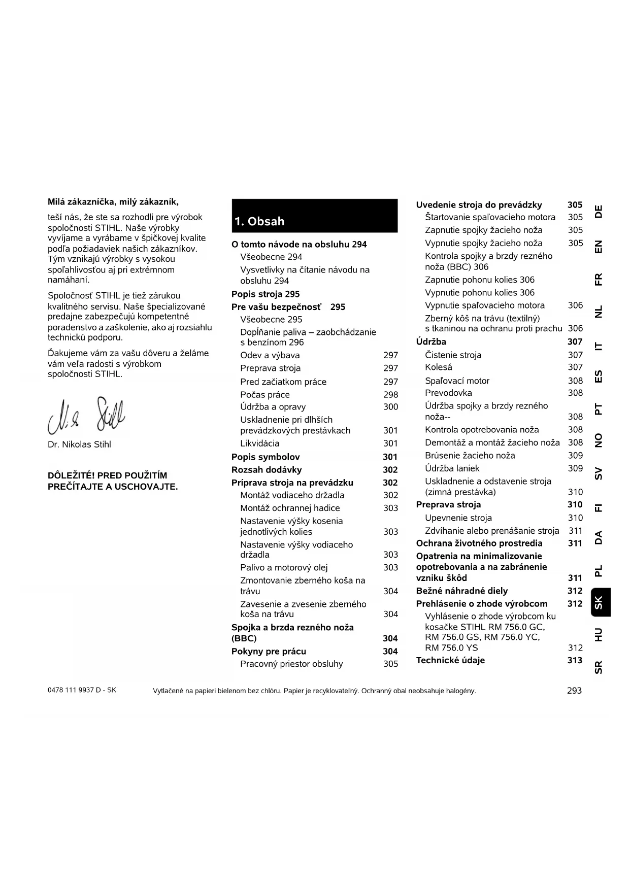 O tomto návode na obsluhu 294 Všeobecne 294 Vysvetlivky na čítanie návodu na obsluhu 294 Popis stroja 295 Pre vašu bezpečnosť 295 Všeobecne 295 Dopĺňanie paliva – zaobchádzanie s benzínom 296 Odev a výbava 297 Preprava stroja 297 Pred začiatkom práce 297 Počas práce 298 Údržba a opravy 300 Uskladnenie pri dlhších prevádzkových prestávkach 301 Likvidácia 301 Popis symbolov 301 Rozsah dodávky 302 Príprava stroja na prevádzku 302 Montáž vodiaceho držadla 302 Montáž ochrannej hadice 303 Nastavenie výšky kosenia jednotlivých kolies 303 Nastavenie výšky vodiaceho držadla 303 Palivo a motorový olej 303 Zmontovanie zberného koša na trávu 304 Zavesenie a zvesenie zberného koša na trávu 304 Spojka a brzda rezného noža (BBC) 304 Pokyny pre prácu 304 Pracovný priestor obsluhy 305 Uvedenie stroja do prevádzky 305 Štartovanie spaľovacieho motora 305 Zapnutie spojky žacieho noža 305 Vypnutie spojky žacieho noža 305 Kontrola spojky a brzdy rezného noža (BBC) 306 Zapnutie pohonu kolies 306 Vypnutie pohonu kolies 306 Vypnutie spaľovacieho motora 306 Zberný kôš na trávu (textilný) s tkaninou na ochranu proti prachu 306 Údržba 307 Čistenie stroja 307 Kolesá 307 Spaľovací motor 308 Prevodovka 308 Údržba spojky a brzdy rezného noža-- 308 Kontrola opotrebovania noža 308 Demontáž a montáž žacieho noža 308 Brúsenie žacieho noža 309 Údržba laniek 309 Uskladnenie a odstavenie stroja (zimná prestávka) 310 Preprava stroja 310 Upevnenie stroja 310 Zdvíhanie alebo prenášanie stroja 311 Ochrana životného prostredia 311 Opatrenia na minimalizovanie opotrebovania a na zabránenie vzniku škôd 311 Bežné náhradné diely 312 Prehlásenie o zhode výrobcom 312 Vyhlásenie o zhode výrobcom ku kosačke STIHL RM 756.0 GC, RM 756.0 GS, RM 756.0 YC, RM 756.0 YS 312 Technické údaje 3130478 111 9937 D - SK