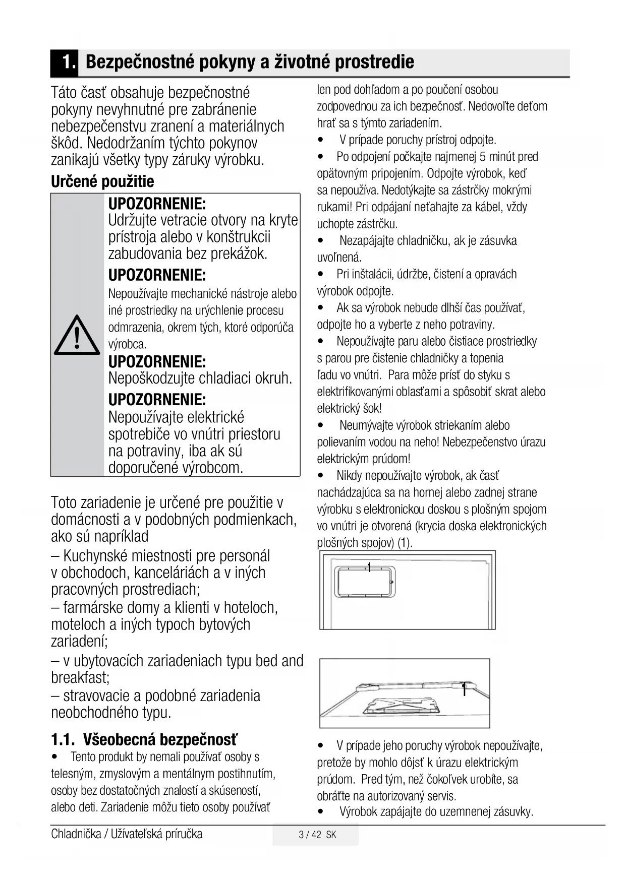 UPOZORNENIE: Udržujte vetracie otvory na kryte prístroja alebo v konštrukcii zabudovania bez prekážok. UPOZORNENIE: Nepoužívajte mechanické nástroje alebo iné prostriedky na urýchlenie procesu odmrazenia, okrem tých, ktoré odporúča výrobca. UPOZORNENIE: Nepoškodzujte chladiaci okruh. UPOZORNENIE: Nepoužívajte elektrické spotrebiče vo vnútri priestoru na potraviny, iba ak sú doporučené výrobcom. Toto zariadenie je určené pre použitie v domácnosti a v podobných podmienkach, ako sú napríklad – Kuchynské miestnosti pre personál v obchodoch, kanceláriách a v iných pracovných prostrediach; – farmárske domy a klienti v hoteloch, moteloch a iných typoch bytových zariadení; – v ubytovacích zariadeniach typu bed and breakfast; – stravovacie a podobné zariadenia neobchodného typu. 1.1. Všeobecná bezpečnosť t Tento produkt by nemali používať osoby s telesným, zmyslovým a mentálnym postihnutím, osoby bez dostatočných znalostí a skúseností, alebo deti. Zariadenie môžu tieto osoby používať len pod dohľadom a po poučení osobou zodpovednou za ich bezpečnosť. Nedovoľte deťom hrať sa s týmto zariadením.t V prípade poruchy prístroj odpojte. t Po odpojení počkajte najmenej 5 minút pred opätovným pripojením. Odpojte výrobok, keď sa nepoužíva. Nedotýkajte sa zástrčky mokrými rukami! Pri odpájaní neťahajte za kábel, vždy uchopte zástrčku.t Nezapájajte chladničku, ak je zásuvka uvoľnená. t Pri inštalácii, údržbe, čistení a opravách výrobok odpojte. t Ak sa výrobok nebude dlhší čas používať, odpojte ho a vyberte z neho potraviny. t Nepoužívajte paru alebo čistiace prostriedky s parou pre čistenie chladničky a topenia ľadu vo vnútri. Para môže prísť do styku s elektrifikovanými oblasťami a spôsobiť skrat alebo elektrický šok!t Neumývajte výrobok striekaním alebo polievaním vodou na neho! Nebezpečenstvo úrazu elektrickým prúdom! t Nikdy nepoužívajte výrobok, ak časť nachádzajúca sa na hornej alebo zadnej strane výrobku s elektronickou doskou s plošným spojom vo vnútri je otvorená (krycia doska elektronických plošných spojov) (1).
