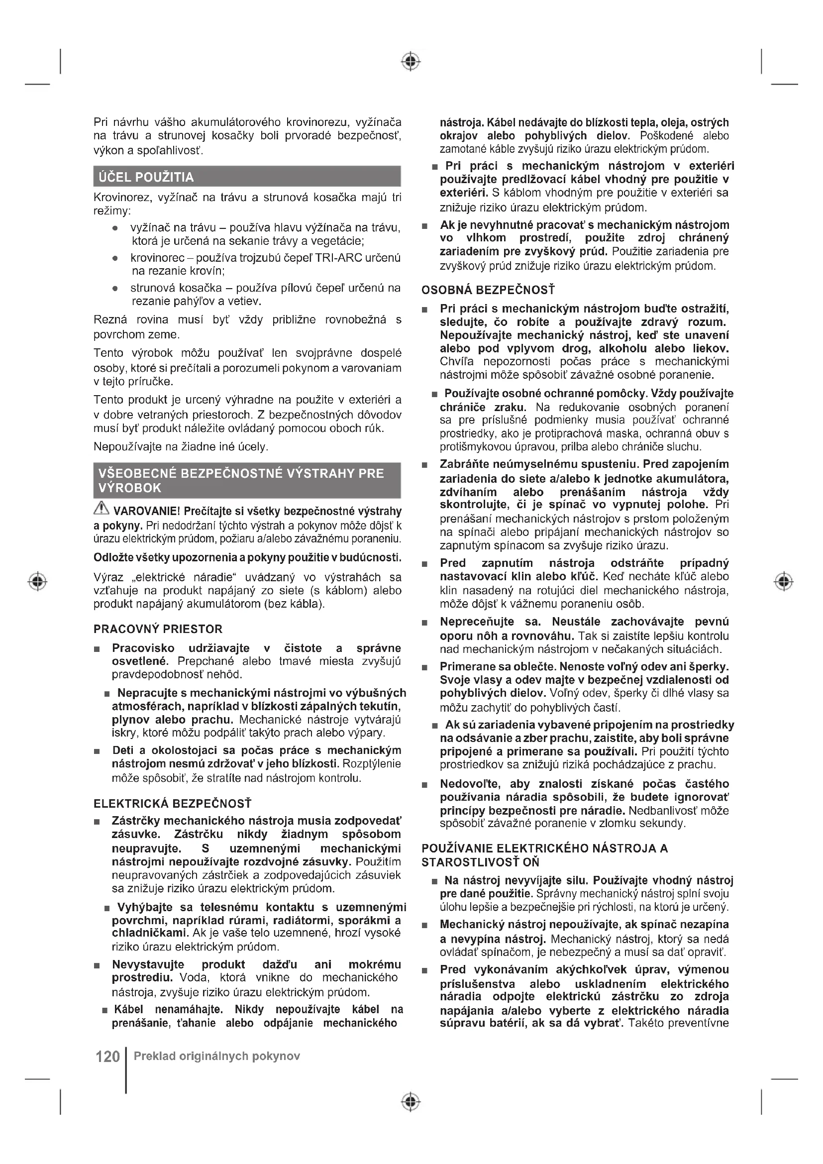 Krovinorez, vyžínač na trávu a strunová kosačka majú tri režimy: ● vyžínač na trávu – používa hlavu výžínača na trávu, ktorá je určená na sekanie trávy a vegetácie; ● krovinorec – používa trojzubú čepeľ TRI-ARC určenú na rezanie krovín; ● strunová kosačka – používa pílovú čepeľ určenú na rezanie pahýľov a vetiev. Rezná rovina musí byť vždy približne rovnobežná s povrchom zeme. Tento výrobok môžu používať len svojprávne dospelé osoby, ktoré si prečítali a porozumeli pokynom a varovaniam v tejto príručke. Tento produkt je urcený výhradne na použite v exteriéri a v dobre vetraných priestoroch. Z bezpečnostných dôvodov musí byť produkt náležite ovládaný pomocou oboch rúk. Nepoužívajte na žiadne iné úcely. VŠEOBECNÉ BEZPEČNOSTNÉ VÝSTRAHY PRE VÝROBOK VAROVANIE! Prečítajte si všetky bezpečnostné výstrahy a pokyny. Pri nedodržaní týchto výstrah a pokynov môže dôjsť k úrazu elektrickým prúdom, požiaru a/alebo závažnému poraneniu. Odložte všetky upozornenia a pokyny použitie v budúcnosti. Výraz „elektrické náradie“ uvádzaný vo výstrahách sa vzťahuje na produkt napájaný zo siete (s káblom) alebo produkt napájaný akumulátorom (bez kábla). PRACOVNÝ PRIESTOR ■ Pracovisko udržiavajte v čistote a správne osvetlené. Prepchané alebo tmavé miesta zvyšujú pravdepodobnosť nehôd. ■ Nepracujte s mechanickými nástrojmi vo výbušných atmosférach, napríklad v blízkosti zápalných tekutín, plynov alebo prachu. Mechanické nástroje vytvárajú iskry, ktoré môžu podpáliť takýto prach alebo výpary. ■ Deti a okolostojaci sa počas práce s mechanickým nástrojom nesmú zdržovať v jeho blízkosti. Rozptýlenie môže spôsobiť, že stratíte nad nástrojom kontrolu.