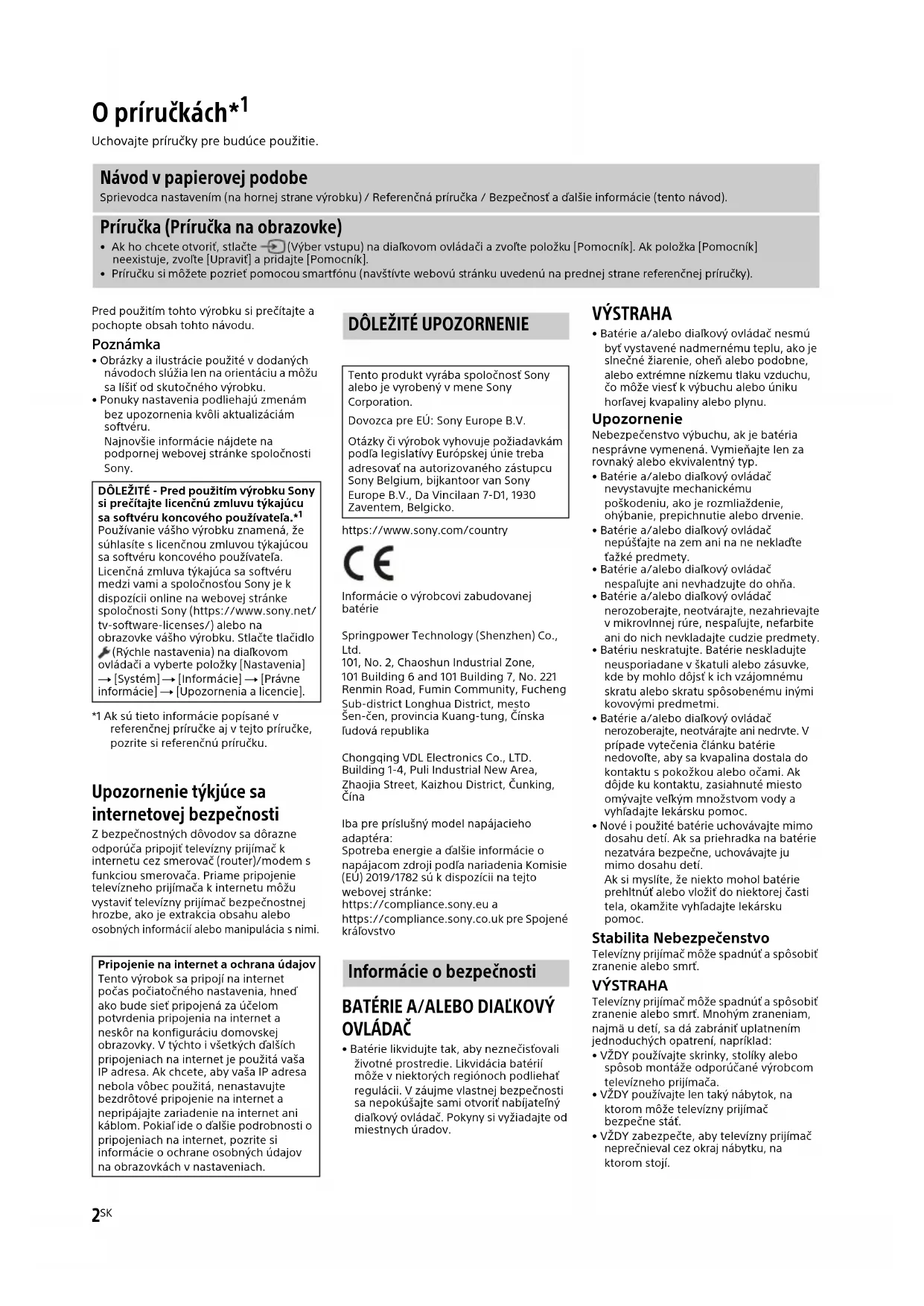 - Obrázky a ilustrácie použité v dodaných návodoch slúžia len na orientáciu a môžu sa líšiť od skutočného výrobku.• Ponuky nastavenia podliehajú zmenám bez upozornenia kvôli aktualizáciám softvéru.Najnovšie informácie nájdete na podpornej webovej stránke spoločnosti Sony. Upozornenie týkjúce sa internetovej bezpečnosti Z bezpečnostných dôvodov sa dôrazne odporúča pripojiť televízny prijímač k internetu cez smerovač (router)/modem s funkciou smerovača. Priame pripojenie televízneho prijímača k internetu môžu vystaviť televízny prijímač bezpečnostnej hrozbe, ako je extrakcia obsahu alebo osobných informácií alebo manipulácia s nimi.https://www.sony.com/countryInformácie o výrobcovi zabudovanej batérieSpringpower Technology (Shenzhen) Co., Ltd. 101, No. 2, Chaoshun Industrial Zone, 101 Building 6 and 101 Building 7, No. 221 Renmin Road, Fumin Community, Fucheng Sub-district Longhua District, mesto Šen-čen, provincia Kuang-tung, Čínska ľudová republikaChongqing VDL Electronics Co., LTD.Building 1-4, Puli Industrial New Area, Zhaojia Street, Kaizhou District, Čunking, Čína Iba pre príslušný model napájacieho adaptéra:Spotreba energie a ďalšie informácie o napájacom zdroji podľa nariadenia Komisie (EÚ) 2019/1782 sú k dispozícii na tejto webovej stránke:https://compliance.sony.eu ahttps://compliance.sony.co.uk pre Spojené kráľovstvo