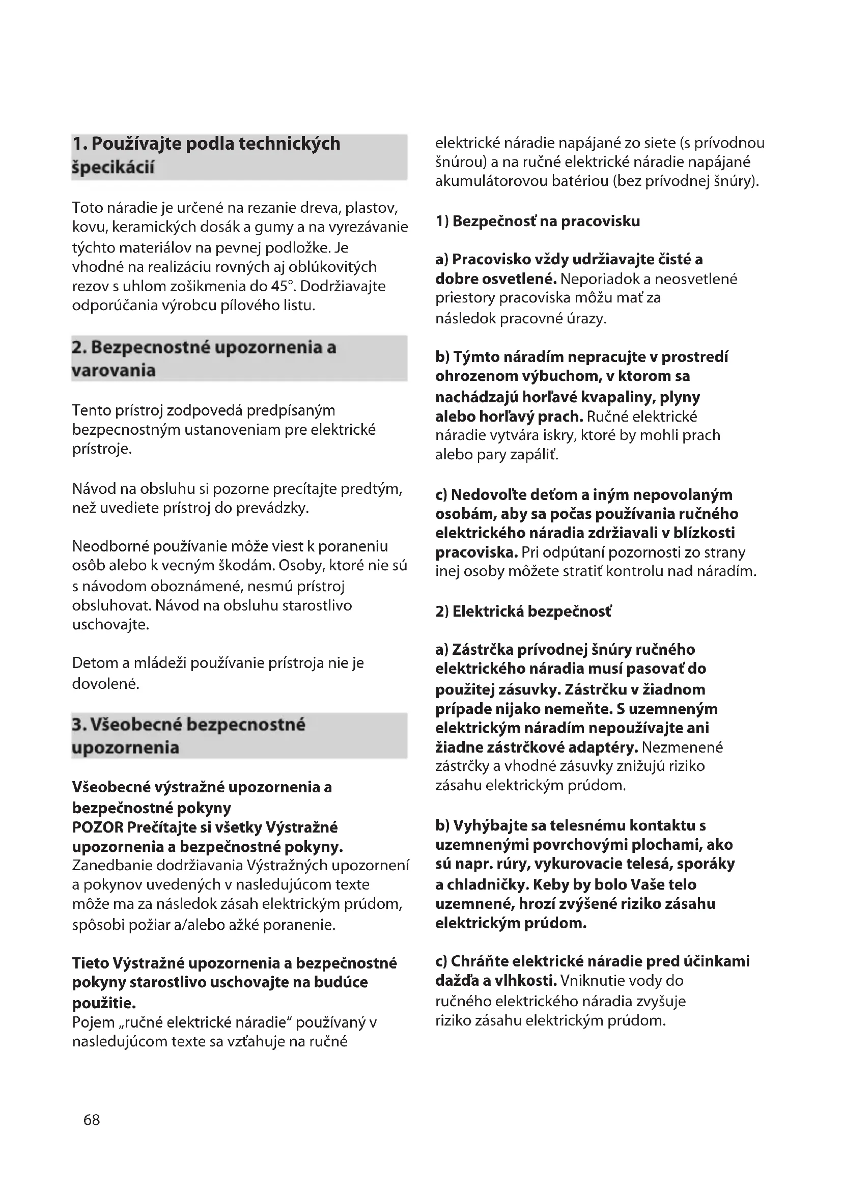 upozornenia Všeobecné výstražné upozornenia a bezpečnostné pokyny POZOR Prečítajte si všetky Výstražné upozornenia a bezpečnostné pokyny. Zanedbanie dodržiavania Výstražných upozornení a pokynov uvedených v nasledujúcom texte môže ma za následok zásah elektrickým prúdom, spôsobi požiar a/alebo ažké poranenie. Tieto Výstražné upozornenia a bezpečnostné pokyny starostlivo uschovajte na budúce použitie. Pojem „ručné elektrické náradie“ používaný v nasledujúcom texte sa vzťahuje na ručné elektrické náradie napájané zo siete (s prívodnou šnúrou) a na ručné elektrické náradie napájané akumulátorovou batériou (bez prívodnej šnúry).