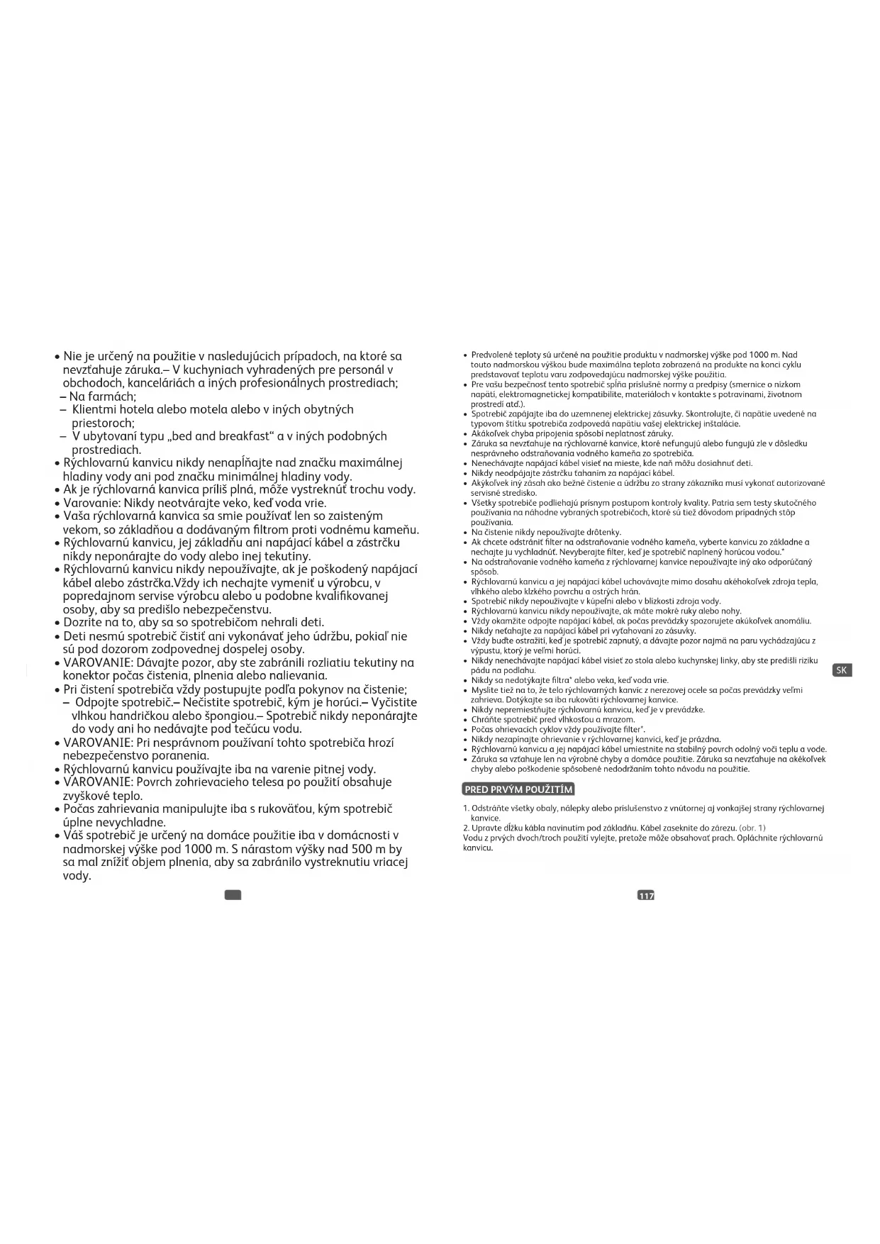 - Rýchlovarná kanvica nefunguje – Skontrolujte, či je rýchlovarná kanvica správne pripojená – Rýchlovarná kanvica bola zapnutá bez vody alebo nahromadenie vodného kameňa spôsobilo aktiváciu poistky proti prehriatiu: nechajte rýchlovarnú kanvicu vychladnúť a naplňte ju vodou. Ak sa nahromadil vodný kameň, najskôr ho odstráňte. Zapnite rýchlovarnú kanvicu: mala by začať znova fungovať asi po 15 minútach. AK VÁM RÝCHLOVARNÁ KANVICA SPADLA NA ZEM, UNIKÁ Z NEJ KVAPALINA ALEBO AK JE VIDITEĽNE POŠKODENÝ NAPÁJACÍ KÁBEL, ZÁSTRČKA ALEBO ZÁKLADŇA KANVICE Vráťte rýchlovarnú kanvicu do strediska popredajného servisu, ktoré je oprávnené vykonávať opravy. Pozrite si záručné podmienky a zoznam stredísk v brožúre dodanej s rýchlovarnou kanvicou. Typ a sériové číslo sú uvedené na spodnej strane vašej rýchlovarnej kanvice. Táto záruka sa vzťahuje len na výrobné chyby a domáce použitie. Záruka sa nevzťahuje na akékoľvek chyby alebo poškodenie spôsobené nedodržaním návodu na použitie.