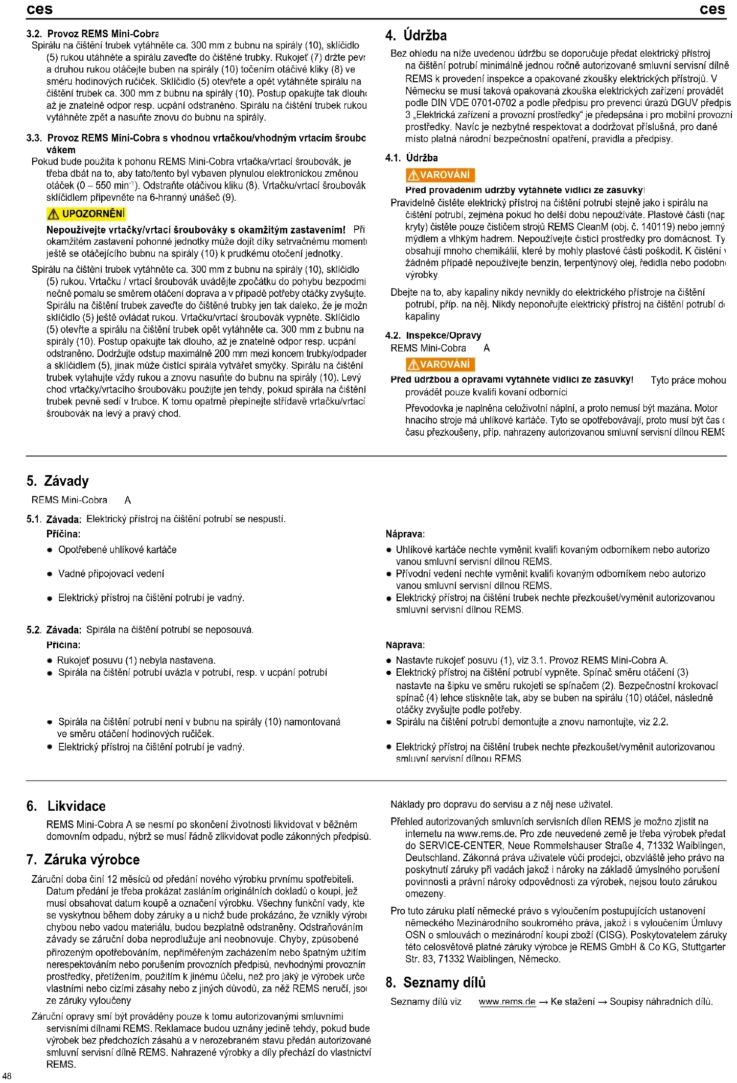 Pred vykonávaním údržbových prác vytiahnite sieťovú zástrčku! Elektrický prístroj na čistenie potrubí, ako aj špirálu na čistenie potrubí pravidelne čistite, najmä ak sa nebude dlhší čas používať. Plastové časti (napríklad kryt) čistite iba s použitím čističa strojov REMS CleanM (číslo výrobku 140119) alebo s použitím jemného mydla a vlhkej handry. Nepoužívajte žiadne čističe určené na použitie v domácnosti. Tieto prípravky obsahujú množstvo chemikálií, ktoré by mohli poškodiť plastové časti. Na čistenie v žiadnom prípade nepoužívajte benzín, terpentínový olej, riedidlo alebo podobné výrobky. Dbajte na to, aby sa do vnútra elektrického prístroja na čistenie potrubí alebo na prístroj nikdy nedostali kvapaliny. Elektrický prístroj na čistenie potrubí nikdy neponárajte do kvapaliny. 4.2. Inšpekcia/Opravy REMS Mini-Cobra