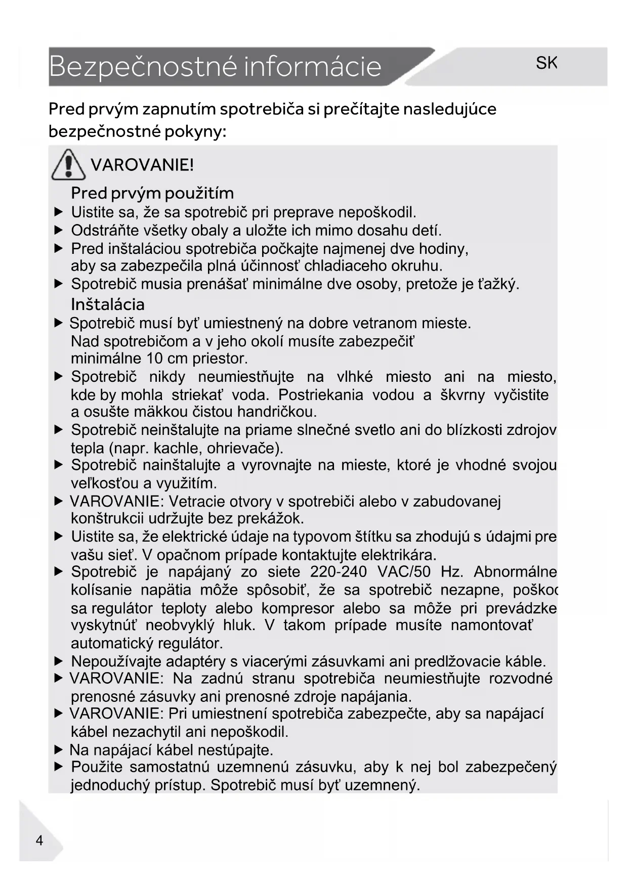 VAROVANIE! Pred prvým použitím Uistite sa, že sa spotrebič pri preprave nepoškodil. Odstráňte všetky obaly a uložte ich mimo dosahu detí. Pred inštaláciou spotrebiča počkajte najmenej dve hodiny, aby sa zabezpečila plná účinnosť chladiaceho okruhu. Spotrebič musia prenášať minimálne dve osoby, pretože je ťažký. Inštalácia Spotrebič musí byť umiestnený na dobre vetranom mieste. Nad spotrebičom a v jeho okolí musíte zabezpečiť minimálne 10 cm priestor. Spotrebič nikdy neumiestňujte na vlhké miesto ani na miesto, kde by mohla striekať voda. Postriekania vodou a škvrny vyčistite a osušte mäkkou čistou handričkou. Spotrebič neinštalujte na priame slnečné svetlo ani do blízkosti zdrojov tepla (napr. kachle, ohrievače). Spotrebič nainštalujte a vyrovnajte na mieste, ktoré je vhodné svojou veľkosťou a využitím. VAROVANIE: Vetracie otvory v spotrebiči alebo v zabudovanej konštrukcii udržujte bez prekážok. Uistite sa, že elektrické údaje na typovom štítku sa zhodujú s údajmi pre vašu sieť. V opačnom prípade kontaktujte elektrikára. Spotrebič je napájaný zo siete 220-240 VAC/50 Hz. Abnormálne kolísanie napätia môže spôsobiť, že sa spotrebič nezapne, poškodí sa regulátor teploty alebo kompresor alebo sa môže pri prevádzke vyskytnúť neobvyklý hluk. V takom prípade musíte namontovať automatický regulátor. Nepoužívajte adaptéry s viacerými zásuvkami ani predlžovacie káble. VAROVANIE: Na zadnú stranu spotrebiča neumiestňujte rozvodné prenosné zásuvky ani prenosné zdroje napájania. VAROVANIE: Pri umiestnení spotrebiča zabezpečte, aby sa napájací kábel nezachytil ani nepoškodil. Na napájací kábel nestúpajte. Použite samostatnú uzemnenú zásuvku, aby k nej bol zabezpečený jednoduchý prístup. Spotrebič musí byť uzemnený.5 Bezpečnostné informácie