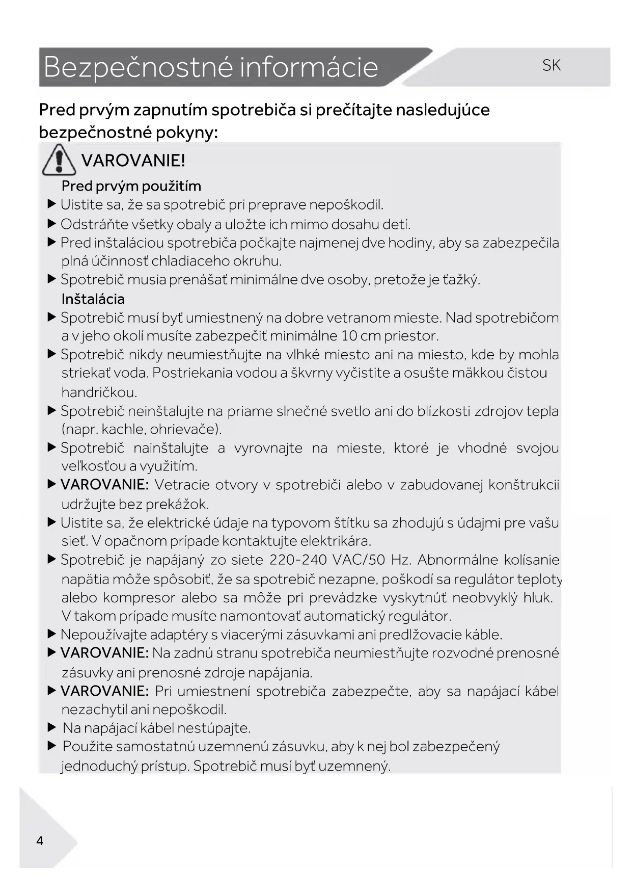 Bezpečnostné info rmácie Pred prvým zapnutím spotrebiča si prečítajte nasledujúce bezpečnostné pokyny:
