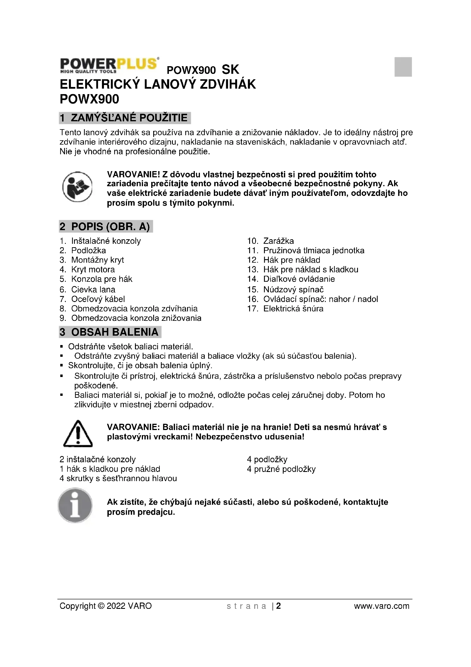 - Po vybalení položiek skontrolujte, či všetky súčasti a príslušenstvo zodpovedajú pokynom. Skontrolujte, či na lanovom zdviháku nie sú záhyby alebo či nie je poškodené, či pripojenia lana nemajú chyby a či motor nebol poškodený dažďom alebo vodou.POWX900 SK Copyright © 2022 VARO s t r a n a | 8 www.varo.com