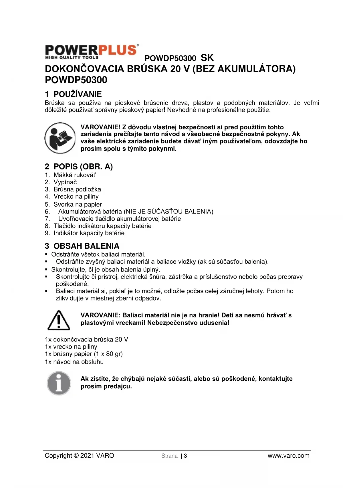 - Baliaci materiál si, pokiaľ je to možné, odložte počas celej záručnej lehoty. Potom ho zlikvidujte v miestnej zberni odpadov. VAROVANIE: Baliaci materiál nie je na hranie! Deti sa nesmú hrávať s plastovými vreckami! Nebezpečenstvo udusenia! 1x dokončovacia brúska 20 V 1x vrecko na piliny 1x brúsny papier (1 x 80 gr) 1x návod na obsluhu Ak zistíte, že chýbajú nejaké súčasti, alebo sú poškodené, kontaktujte prosím predajcu.POWDP50300 SK Copyright © 2021 VARO Strana | 4 www.varo.com 4 VYSVETLENIE SYMBOLOV V tomto návode a/alebo na stroji sa používajú nasledujúce symboly: