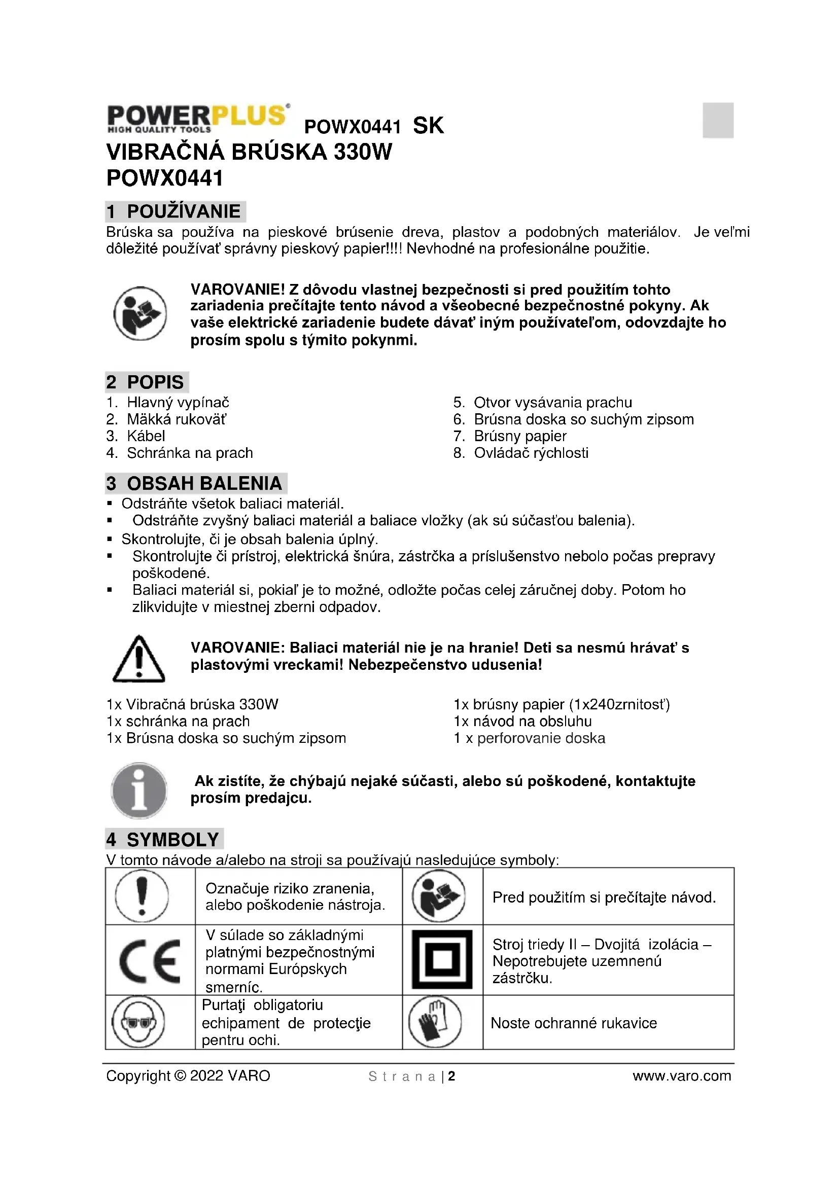 POWX0441 1 POUŽÍVANIE Brúska sa používa na pieskové brúsenie dreva, plastov a podobných materiálov. Je veľmi dôležité používať správny pieskový papier!!!! Nevhodné na profesionálne použitie. VAROVANIE! Z dôvodu vlastnej bezpečnosti si pred použitím tohto zariadenia prečítajte tento návod a všeobecné bezpečnostné pokyny. Ak vaše elektrické zariadenie budete dávať iným používateľom, odovzdajte ho prosím spolu s týmito pokynmi. 2 POPIS