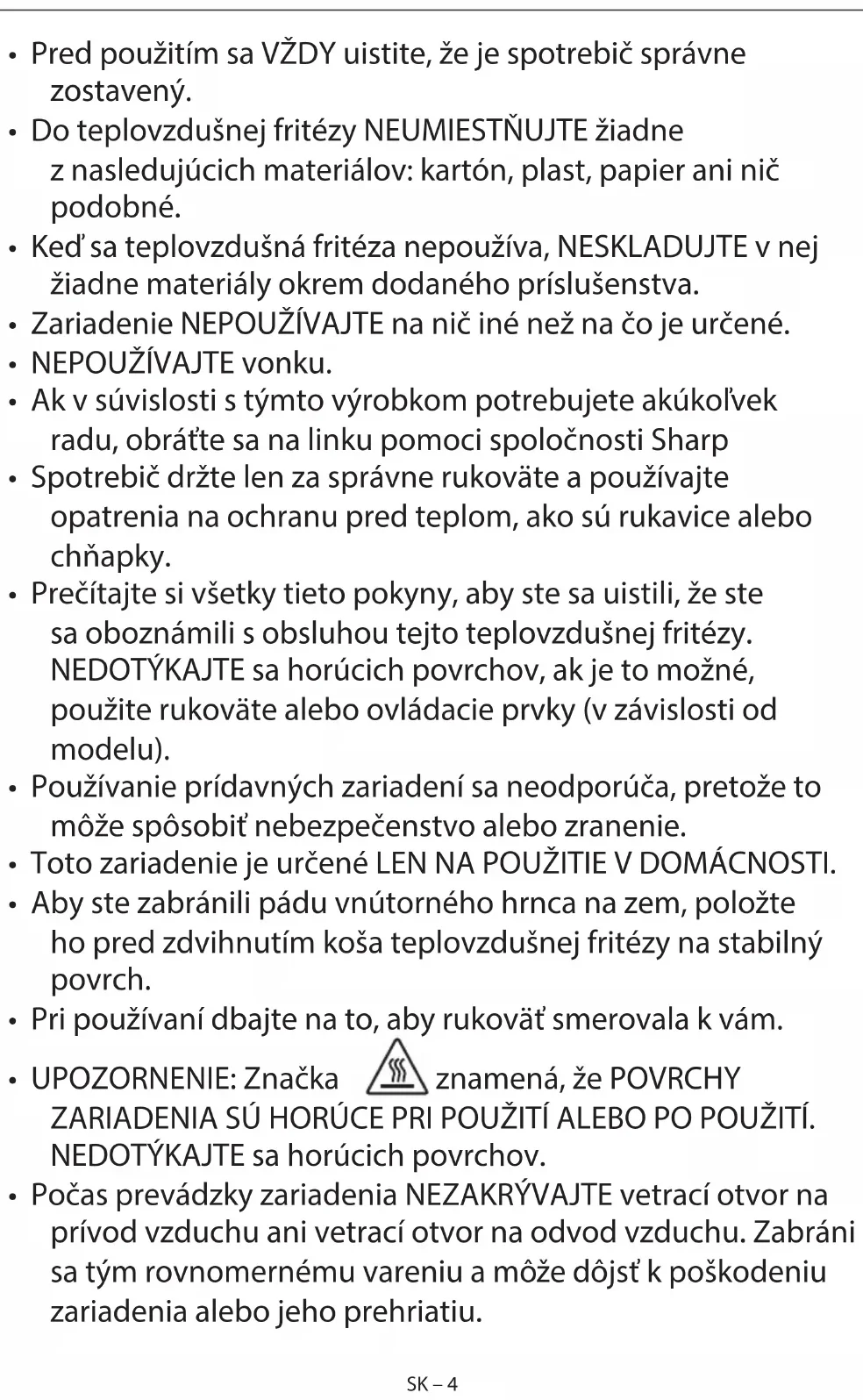 PRED POUŽITÍM TEPLOVZDUŠNEJ FRITÉZY Pred prvým použitím teplovzdušnej fritézy sa odporúča po úplnom vybalení a odstránení všetkých obalov vyčistiť vnútorný hrniec a fritovací kôš v horúcej mydlovej vode alebo v umývačke riadu. Potom dôkladne vysušte všetko príslušenstvo a znovu ho zostavte do teplovzdušnej fritézy. Pred použitím utrite vonkajšie telo a vnútorné časti vlhkou handričkou a osušte. Zapojte svoju novú teplovzdušnú fritézu do elektrickej siete a môžete ju začať používať.Pred použitím sa odporúča prečítať si tieto pokyny.SK – 10 SK – 10