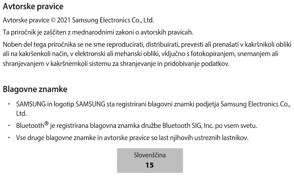 Z dôvodu vlastnej bezpečnosti sa nesmiete pokúšať vyberať batériu sami. Ak batéria nebude vybratá správne, môže to mať za následok poškodenie batérie a zariadenia, spôsobiť zranenie alebo narušiť bezpečnosť zariadenia. Spoločnosť Samsung odmieta zodpovednosť za akékoľvek poškodenie alebo stratu (či už na základe zmluvy alebo spôsobené úmyselne vrátane nedbanlivosti), ktoré mohli byť spôsobené nedodržaním týchto upozornení a pokynov, s výnimkou smrti alebo zranenia zapríčineného nedbanlivosťou zo strany spoločnosti Samsung. Slovenčina 14Autorské práva Copyright © 2021 Samsung Electronics Co., Ltd. Na túto príručku sa vzťahujú medzinárodné zákony o ochrane autorských práv. Žiadna časť tejto príručky sa nesmie reprodukovať, distribuovať, prekladať ani prenášať v žiadnej forme ani žiadnymi spôsobmi, či už elektronickými alebo mechanickými, vrátane fotokopírovania, nahrávania a ukladania v ľubovoľnom systéme na ukladanie a získavanie informácií. Ochranné známky