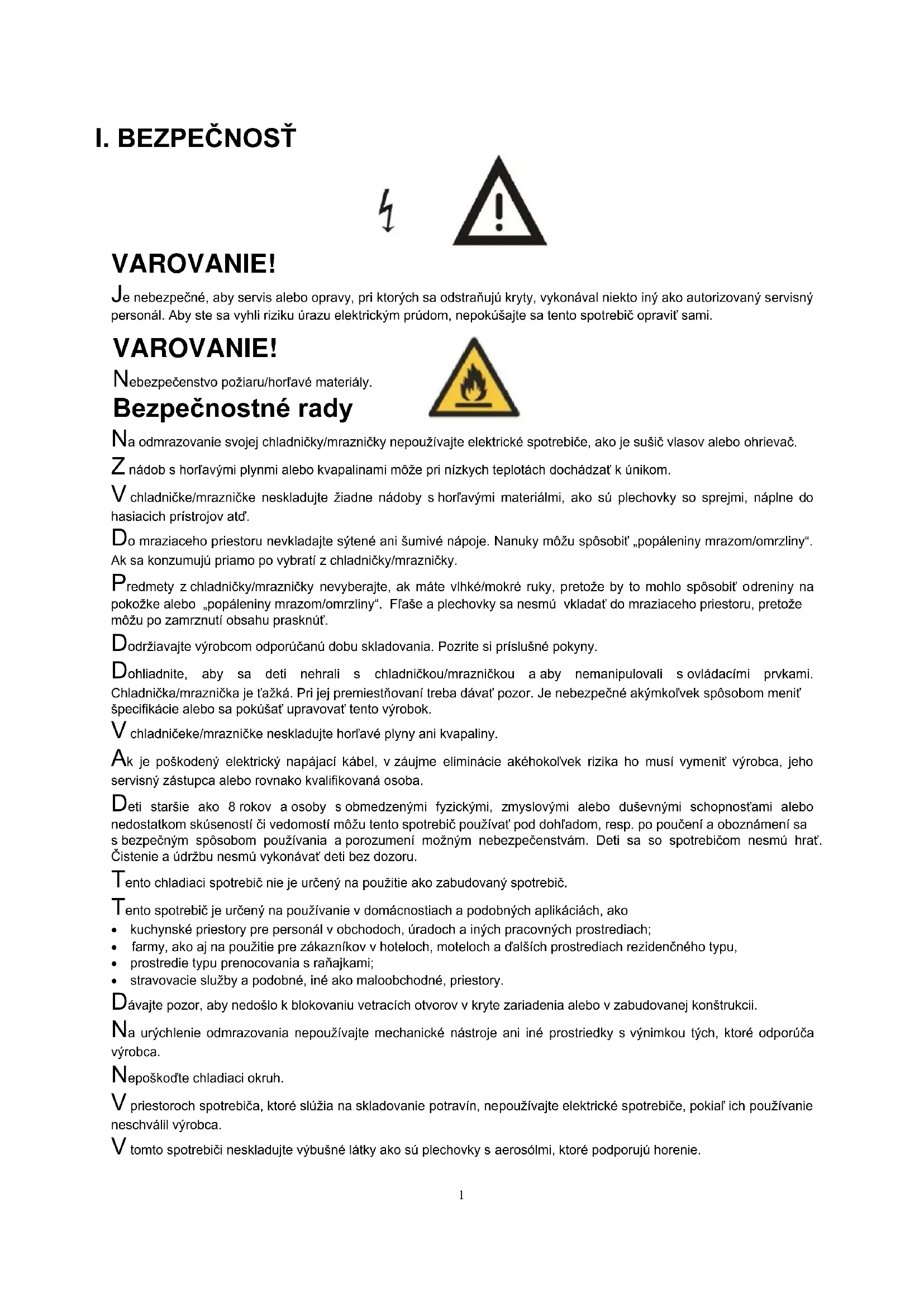 VAROVANIE! Je nebezpečné, aby servis alebo opravy, pri ktorých sa odstraňujú kryty, vykonával niekto iný ako autorizovaný servisný personál. Aby ste sa vyhli riziku úrazu elektrickým prúdom, nepokúšajte sa tento spotrebič opraviť sami. VAROVANIE! Nebezpečenstvo požiaru/horľavé materiály. Bezpečnostné rady Na odmrazovanie svojej chladničky/mrazničky nepoužívajte elektrické spotrebiče, ako je sušič vlasov alebo ohrievač. Z nádob s horľavými plynmi alebo kvapalinami môže pri nízkych teplotách dochádzať k únikom. V chladničke/mrazničke neskladujte žiadne nádoby s horľavými materiálmi, ako sú plechovky so sprejmi, náplne do hasiacich prístrojov atď. Do mraziaceho priestoru nevkladajte sýtené ani šumivé nápoje. Nanuky môžu spôsobiť „popáleniny mrazom/omrzliny“. Ak sa konzumujú priamo po vybratí z chladničky/mrazničky. Predmety z chladničky/mrazničky nevyberajte, ak máte vlhké/mokré ruky, pretože by to mohlo spôsobiť odreniny na pokožke alebo „popáleniny mrazom/omrzliny“. Fľaše a plechovky sa nesmú vkladať do mraziaceho priestoru, pretože môžu po zamrznutí obsahu prasknúť. Dodržiavajte výrobcom odporúčanú dobu skladovania. Pozrite si príslušné pokyny. Dohliadnite, aby sa deti nehrali s chladničkou/mrazničkou a aby nemanipulovali s ovládacími prvkami. Chladnička/mraznička je ťažká. Pri jej premiestňovaní treba dávať pozor. Je nebezpečné akýmkoľvek spôsobom meniť špecifikácie alebo sa pokúšať upravovať tento výrobok. V chladničeke/mrazničke neskladujte horľavé plyny ani kvapaliny. Ak je poškodený elektrický napájací kábel, v záujme eliminácie akéhokoľvek rizika ho musí vymeniť výrobca, jeho servisný zástupca alebo rovnako kvalifikovaná osoba. Deti staršie ako 8 rokov a osoby s obmedzenými fyzickými, zmyslovými alebo duševnými schopnosťami alebo nedostatkom skúseností či vedomostí môžu tento spotrebič používať pod dohľadom, resp. po poučení a oboznámení sa s bezpečným spôsobom používania a porozumení možným nebezpečenstvám. Deti sa so spotrebičom nesmú hrať. Čistenie a údržbu nesmú vykonávať deti bez dozoru. Tento chladiaci spotrebič nie je určený na použitie ako zabudovaný spotrebič. Tento spotrebič je určený na používanie v domácnostiach a podobných aplikáciách, ako