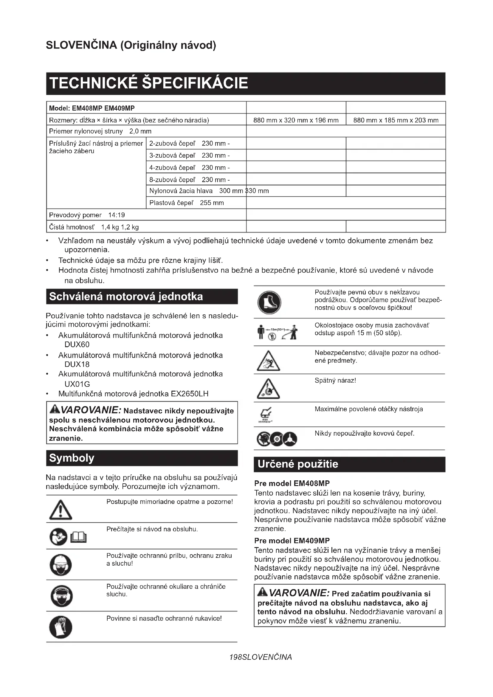 Model: EM408MP EM409MP Rozmery:dĺžkaךírka×výška(bezsečnéhonáradia) 880 mm x 320 mm x 196 mm 880 mm x 185 mm x 203 mm Priemernylonovejstruny 2,0 mm Príslušnýžacínástrojapriemer žaciehozáberu 2-zubováčepeľ 230 mm - 3-zubováčepeľ 230 mm - 4-zubováčepeľ 230 mm - 8-zubováčepeľ 230 mm - Nylonovážaciahlava 300 mm 330 mm Plastováčepeľ 255 mm Prevodovýpomer 14:19 Čistáhmotnosť 1,4 kg 1,2 kg