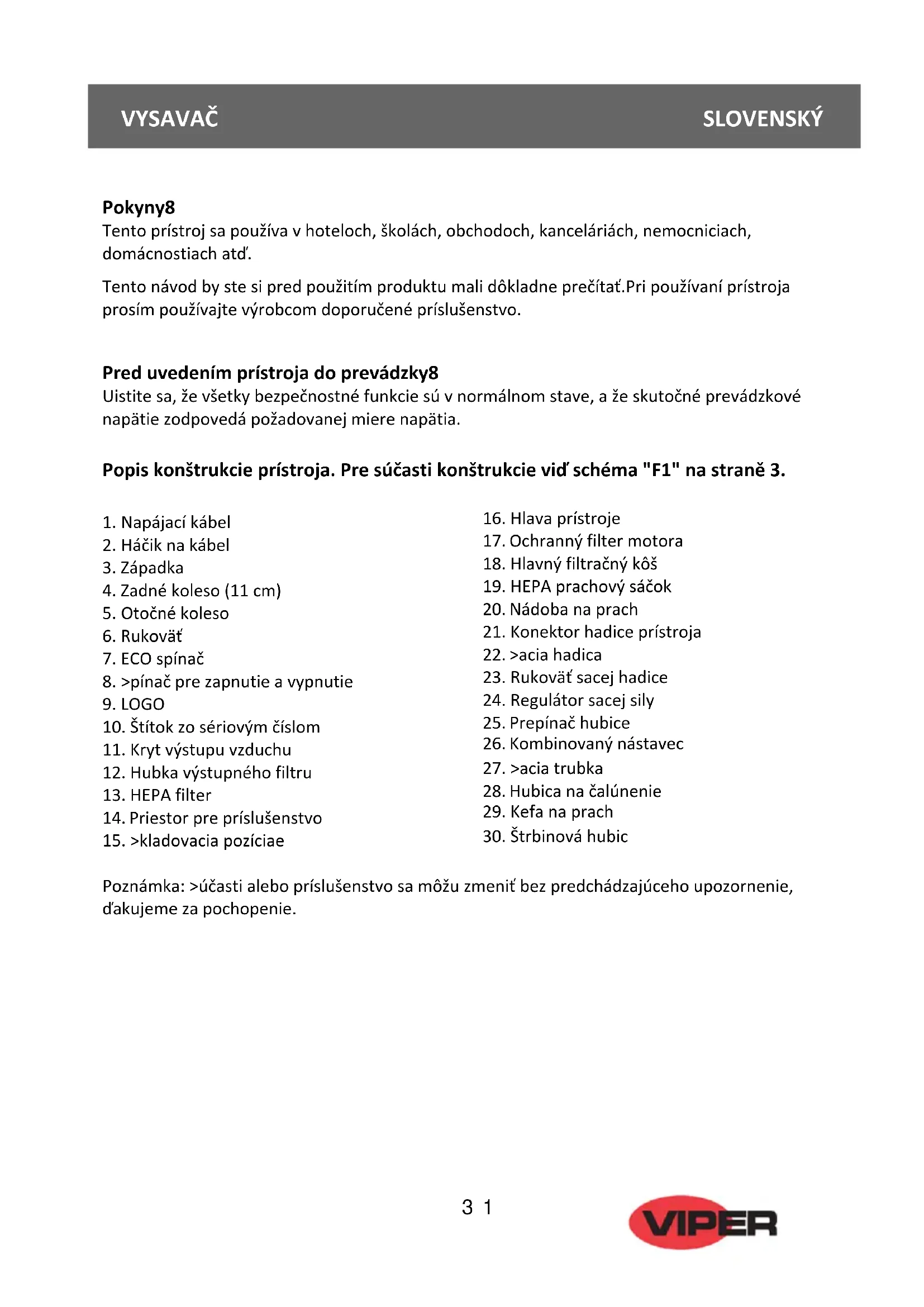 Štrbinovú hubicu je možné použiť pre čistenie úzkych a ťažko prístupných miest, kefu na prach a hubicu na čalúnenie je možné použiť na čistenie záclon a čalúneného nábytku. Záruka Tento produkt bol navrhnutý tak, aby spolu so správnou údržbou poskytol bezporuchový chod po niekoľko rokov. Na prístroj sa vzťahuje záruka 12 mesiacov, ktorá pokrýva závady na komponentoch. Ak na vašom produkte VIPER zaznamenáte závadu, obráťte sa prosím na predajcu, u ktorého ste produkt kúpili, alebo na najbližšieho autorizovaného predajcu produktov VIPER. Záruka sa nevzťahuje na: