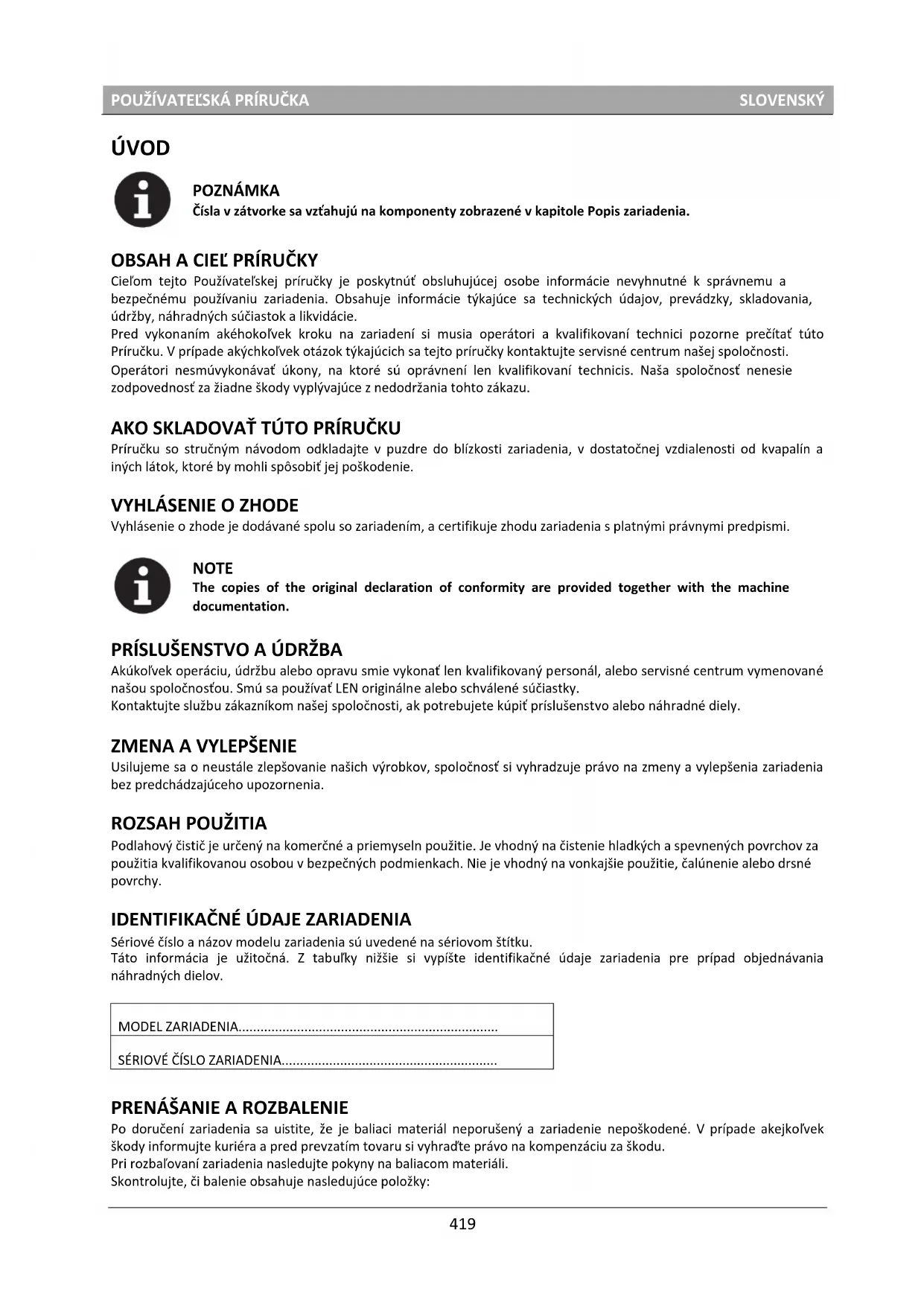 Cieľom tejto Používateľskej príručky je poskytnúť obsluhujúcej osobe informácie nevyhnutné k správnemu a bezpečnému používaniu zariadenia. Obsahuje informácie týkajúce sa technických údajov, prevádzky, skladovania, údržby, náhradných súčiastok a likvidácie. Pred vykonaním akéhokoľvek kroku na zariadení si musia operátori a kvalifikovaní technici pozorne prečítať túto Príručku. V prípade akýchkoľvek otázok týkajúcich sa tejto príručky kontaktujte servisné centrum našej spoločnosti. Operátori nesmúvykonávať úkony, na ktoré sú oprávnení len kvalifikovaní technicis. Naša spoločnosť nenesie zodpovednosť za žiadne škody vyplývajúce z nedodržania tohto zákazu. AKO SKLADOVAŤ TÚTO PRÍRUČKU Príručku so stručným návodom odkladajte v puzdre do blízkosti zariadenia, v dostatočnej vzdialenosti od kvapalín a iných látok, ktoré by mohli spôsobiť jej poškodenie.