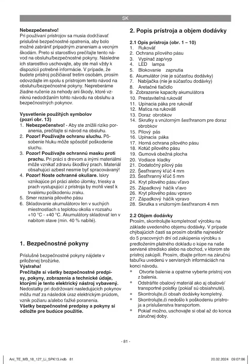 Skladujte prístroj a jeho príslušenstvo na tmavom, suchom a nezamŕzajúcom mieste mimo dosahu detí. Optimálna teplota pre skladovanie je medzi 5 až 30 °C. Skladujte tento elektrický prístroj v ori- ginálnom balení. Upozornenie! Na ochranu pílového pásu odporúčame, aby ste pílový pás uvoľnili, ak sa dlhší čas nepoužíva (pozri 5.5). Okrem toho pri dlhšom skladovaní odporúčame vodiace kladky (20) chrániť minerálnym olejom. Anl_TE_MB_18_127_Li_SPK13.indb 86Anl_TE_MB_18_127_Li_SPK13.indb 86 20.02.2024 09:07:0720.02.2024 09:07:07SK