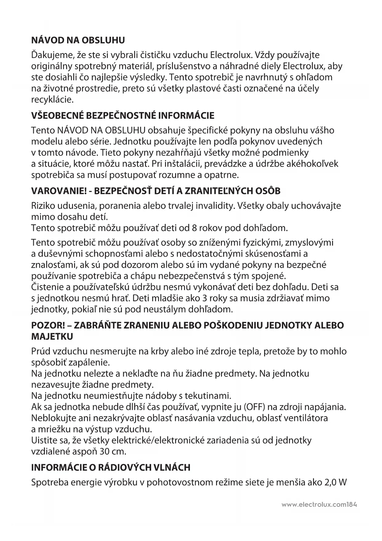 Ďakujeme, že ste si vybrali čističku vzduchu Electrolux. Vždy používajte originálny spotrebný materiál, príslušenstvo anáhradné diely Electrolux, aby ste dosiahli čo najlepšie výsledky. Tento spotrebič je navrhnutý sohľadom na životné prostredie, preto sú všetky plastové časti označené na účely recyklácie.