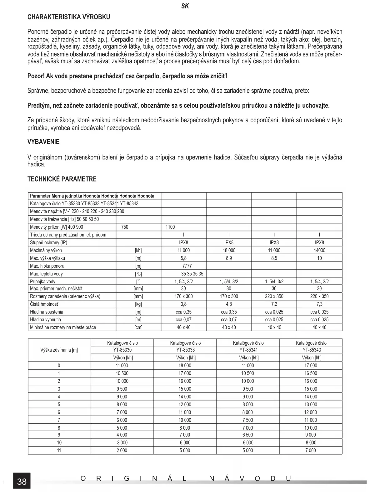 Ponorné čerpadlo je určené na prečerpávanie čistej vody alebo mechanicky trochu znečistenej vody z nádrží (napr. neveľkých bazénov, záhradných očiek ap.). Čerpadlo nie je určené na prečerpávanie iných kvapalín než voda, takých ako: olej, benzín, rozpúšťadlá, kyseliny, zásady, organické látky, tuky, odpadové vody, ani vody, ktorá je znečistená takými látkami. Prečerpávaná voda tiež nesmie obsahovať mechanické nečistoty alebo iné čiastočky s brúsnymi vlastnosťami. Znečistená voda sa môže prečer- pávať, avšak musí sa zachovávať zvláštna opatrnosť a proces prečerpávania musí byť celý čas pod dohľadom. Pozor! Ak voda prestane prechádzať cez čerpadlo, čerpadlo sa môže zničiť! Správne, bezporuchové a bezpečné fungovanie zariadenia závisí od toho, či sa zariadenie správne používa, preto: Predtým, než začnete zariadenie používať, oboznámte sa s celou používateľskou príručkou a náležite ju uchovajte. Za prípadné škody, ktoré vzniknú následkom nedodržiavania bezpečnostných pokynov a odporúčaní, ktoré sú uvedené v tejto príručke, výrobca ani dodávateľ nezodpovedá. VYBAVENIE V originálnom (továrenskom) balení je čerpadlo a prípojka na upevnenie hadice. Súčas ťou súpravy čerpadla nie je výtlačná hadica. TECHNICKÉ PARAMETRE Parameter Merná jednotka Hodnota Hodnota Hodnota Hodnota Katalógové číslo YT-85330 YT-85333 YT-85341 YT-85343 Menovité napätie [V~] 220 - 240 220 - 240 230 230 Menovitá frekvencia [Hz] 50 50 50 50 Menovitý príkon [W] 400 900 750 1100 Trieda ochrany pred zásahom el. prúdom I I I I Stupeň ochrany (IP) IPX8 IPX8 IPX8 IPX8 Maximálny výkon [l/h] 11 000 18 000 11 000 14000 Max. výška výtlaku [m] 5,8 8,9 8,5 10 Max. hĺbka ponoru [m] 7777 Max. teplota vody [