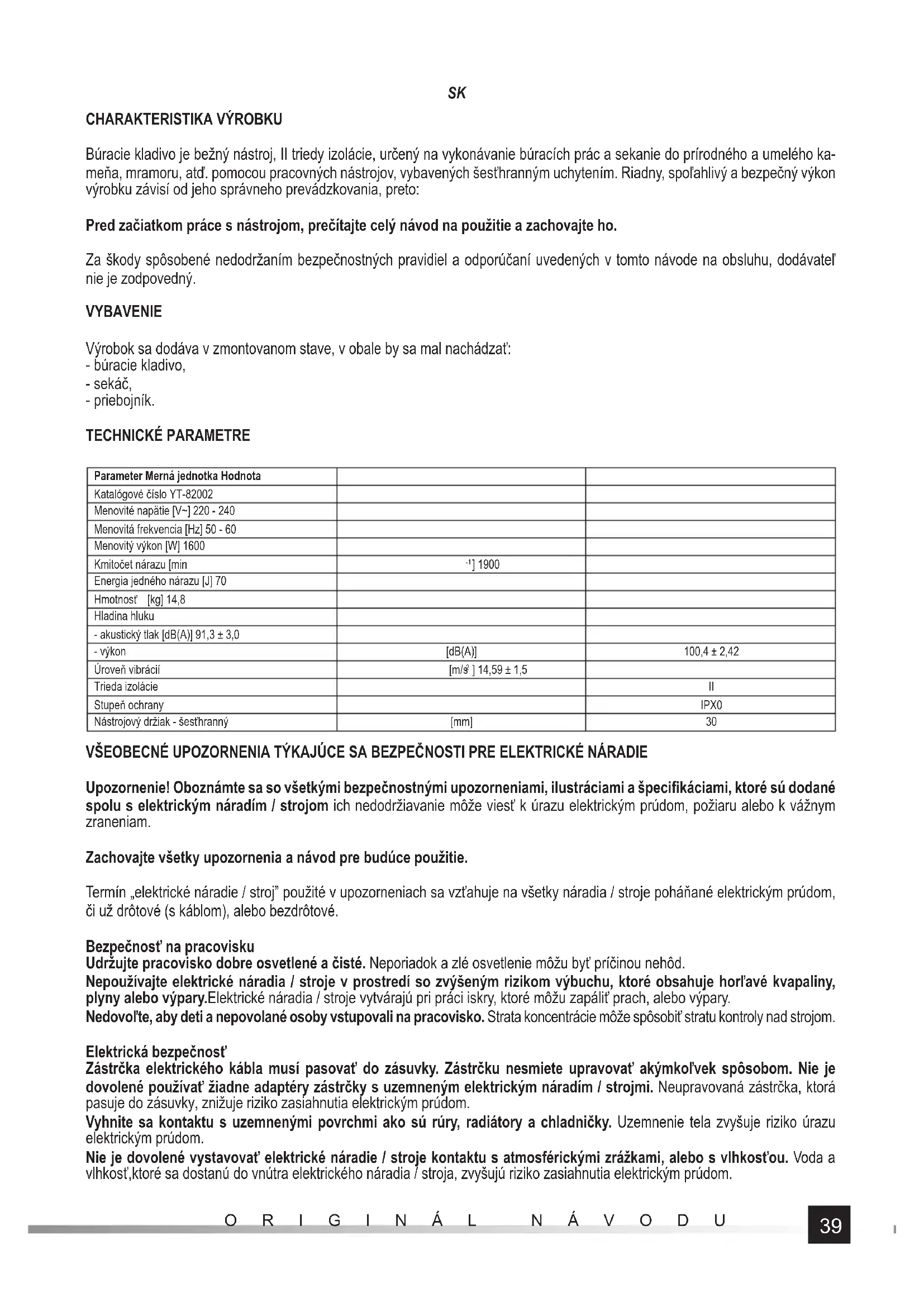 Búracie kladivo je bežný nástroj, II triedy izolácie, určený na vykonávanie búracích prác a sekanie do prírodného a umelého ka- meňa, mramoru, atď. pomocou pracovných nástrojov, vybavených šesťhranným uchytením. Riadny, spoľahlivý a bezpečný výkon výrobku závisí od jeho správneho prevádzkovania, preto: Pred začiatkom práce s nástrojom, prečítajte celý návod na použitie a zachovajte ho. Za škody spôsobené nedodržaním bezpečnostných pravidiel a odporúčaní uvedených v tomto návode na obsluhu, dodávateľ nie je zodpovedný. VYBAVENIE Výrobok sa dodáva v zmontovanom stave, v obale by sa mal nachádzať: - búracie kladivo, - sekáč, - priebojník. TECHNICKÉ PARAMETRE Parameter Merná jednotka Hodnota Katalógové číslo YT-82002 Menovité napätie [V~] 220 - 240 Menovitá frekvencia [Hz] 50 - 60 Menovitý výkon [W] 1600 Kmitočet nárazu [min