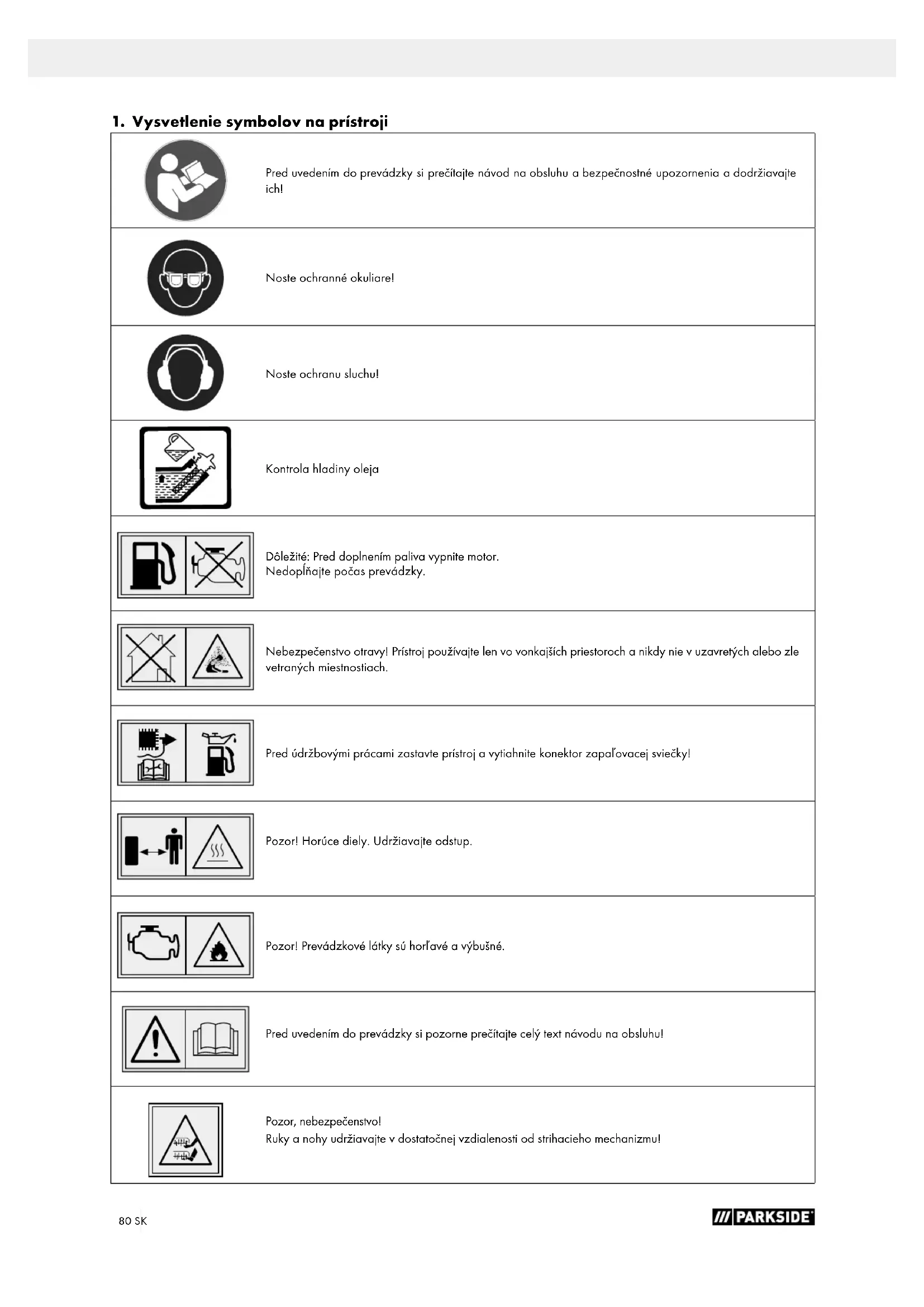 Preduvedením doprevádzky si prečítajte návod naobsluhu abezpečnostné upozornenia adodržiavajte ich! Noste ochranné okuliare! Noste ochranu sluchu! Kontrola hladiny oleja Dôležité: Pred doplnením paliva vypnite motor. Nedopĺňajte počas prevádzky. Nebezpečenstvo otravy! Prístroj používajte len vo vonkajších priestoroch a nikdy nie v uzavretých alebo zle vetraných miestnostiach. Pred údržbovými prácami zastavte prístroj a vytiahnite konektor zapaľovacej sviečky! Pozor! Horúce diely. Udržiavajte odstup. Pozor! Prevádzkové látky sú horľavé avýbušné. Pred uvedením do prevádzky si pozorne prečítajte celý text návodu na obsluhu! Pozor, nebezpečenstvo! Ruky a nohy udržiavajte v dostatočnej vzdialenosti od strihacieho mechanizmu!81SK Pozor! Nebezpečenstvo poranenia spôsobené vymrštenými predmetmi! Zaručená hladina akustického výkonu zariadenia Výrobok zodpovedá platným európskym smerniciam. STOP MOTOR Prístroj sa zastaví pri uvoľnení bezpečnostnej spínacej páky. Vtomto návode naobsluhu sme miesta, ktoré sa týkajú vašej bezpečnosti, označili práve týmto znakom. Objem zberného koša Hmotnosť v kg Pracovná šírka Objem nádrže Motorový olej NEBEZPEČEN- STVO! Signálne slovo na označenie bezprostredne hroziacej nebezpečnej situácie, ktorá, ak sa jej nezabráni, bude mať za následok smrť alebo vážne poranenie.82 SK VAROVANIE! Signálne slovo na označenie možnej nebezpečnej situácie, ktorá, ak sa jej nezabráni, by mohla mať za následok smrť alebo vážne poranenie. POZOR! Signálne slovo na označenie možnej nebezpečnej situácie, ktorá, ak sa jej nezabráni, môže viesť k ľahké- mu alebo stredne ťažkému poraneniu. UPOZORNENIE Signálne slovo na označenie možnej nebezpečnej situácie, ktorá, ak sa jej nezabráni, môže viesť k mate- riálnym škodám na produkte alebo majetku/vlastníctve.83SK