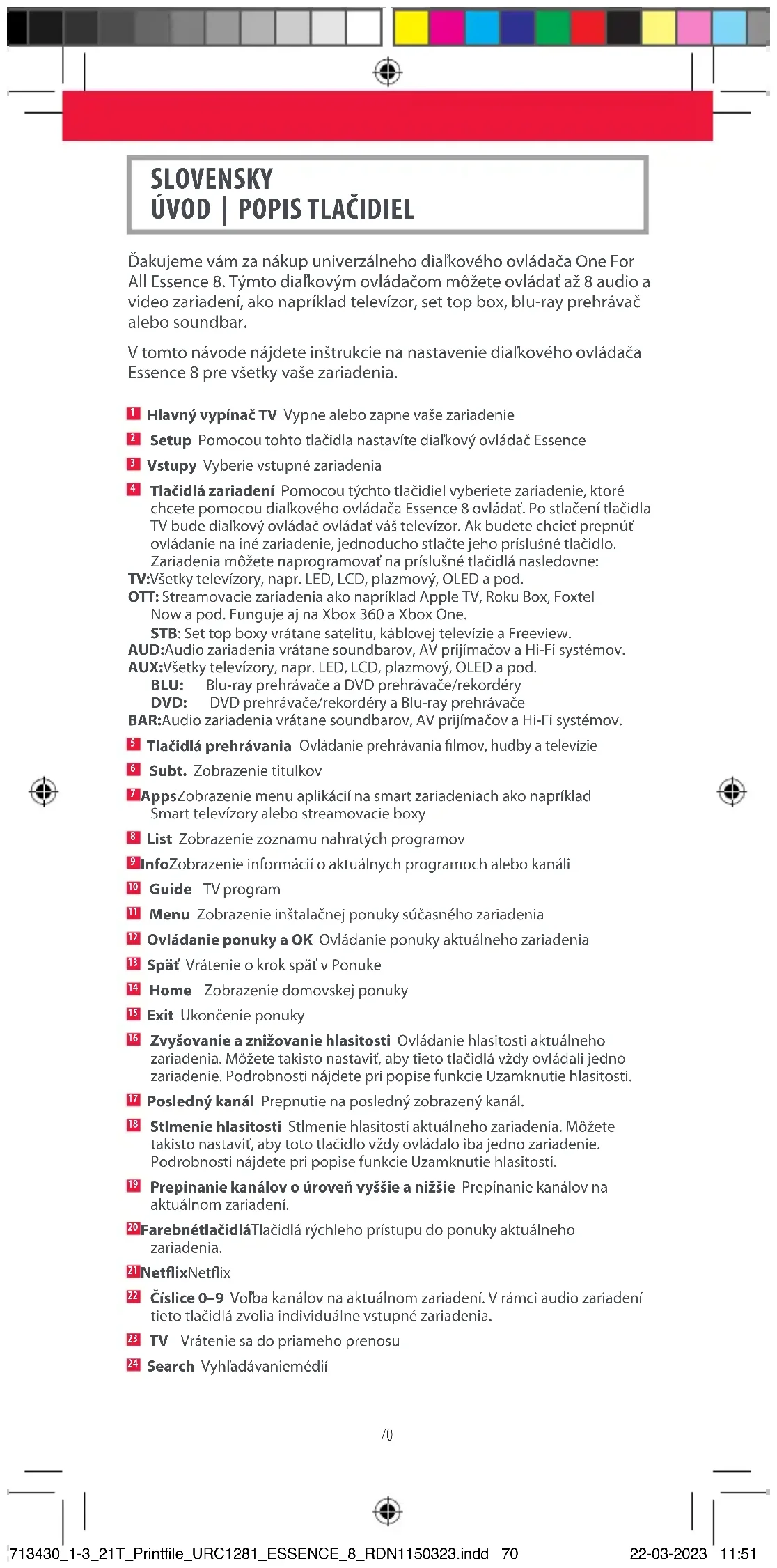 Search Vyhľadávanie médií 713430_1-3_21T_Printfile_URC1281_ESSENCE_8_RDN1150323.indd 70713430_1-3_21T_Printfile_URC1281_ESSENCE_8_RDN1150323.indd 70 22-03-2023 11:5122-03-2023 11:5171 Diaľkový ovládač Essence 8 je prednastavený na okamžité ovládanie vybraných najpopulárnejších zariadení. Ak vlastníte jedno z nasledujú