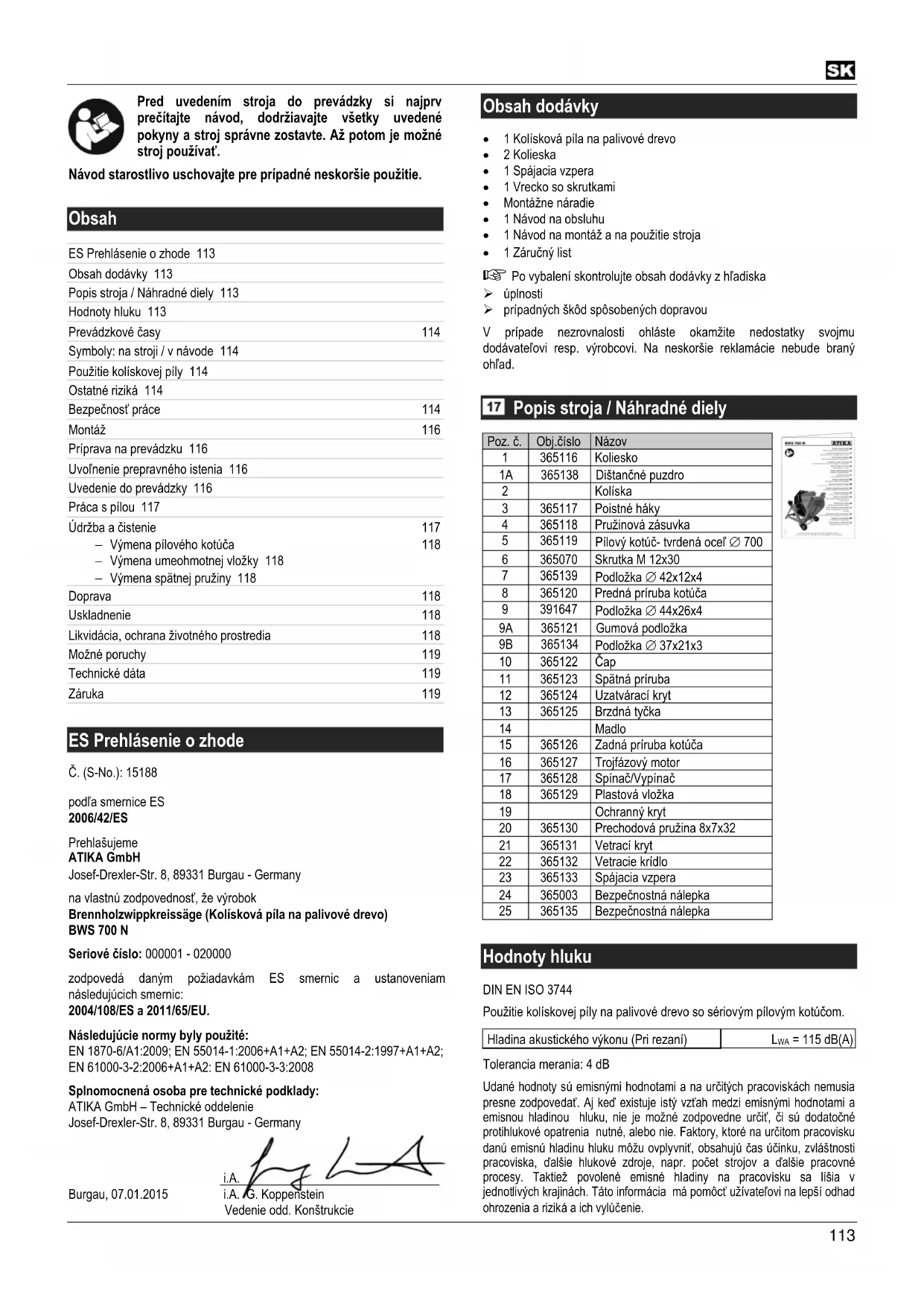 Obsah ES Prehlásenie o zhode 113 Obsah dodávky 113 Popis stroja / Náhradné diely 113 Hodnoty hluku 113 Prevádzkové časy 114 Symboly: na stroji / v návode 114 Použitie kolískovej píly 114 Ostatné riziká 114 Bezpečnosť práce 114 Montáž 116 Príprava na prevádzku 116 Uvoľnenie prepravného istenia 116 Uvedenie do prevádzky 116 Práca s pílou 117 Údržba a čistenie 117 − Výmena pílového kotúča 118 − Výmena umeohmotnej vložky 118 − Výmena spätnej pružiny 118 Doprava 118 Uskladnenie 118 Likvidácia, ochrana životného prostredia 118 Možné poruchy 119 Technické dáta 119 Záruka 119