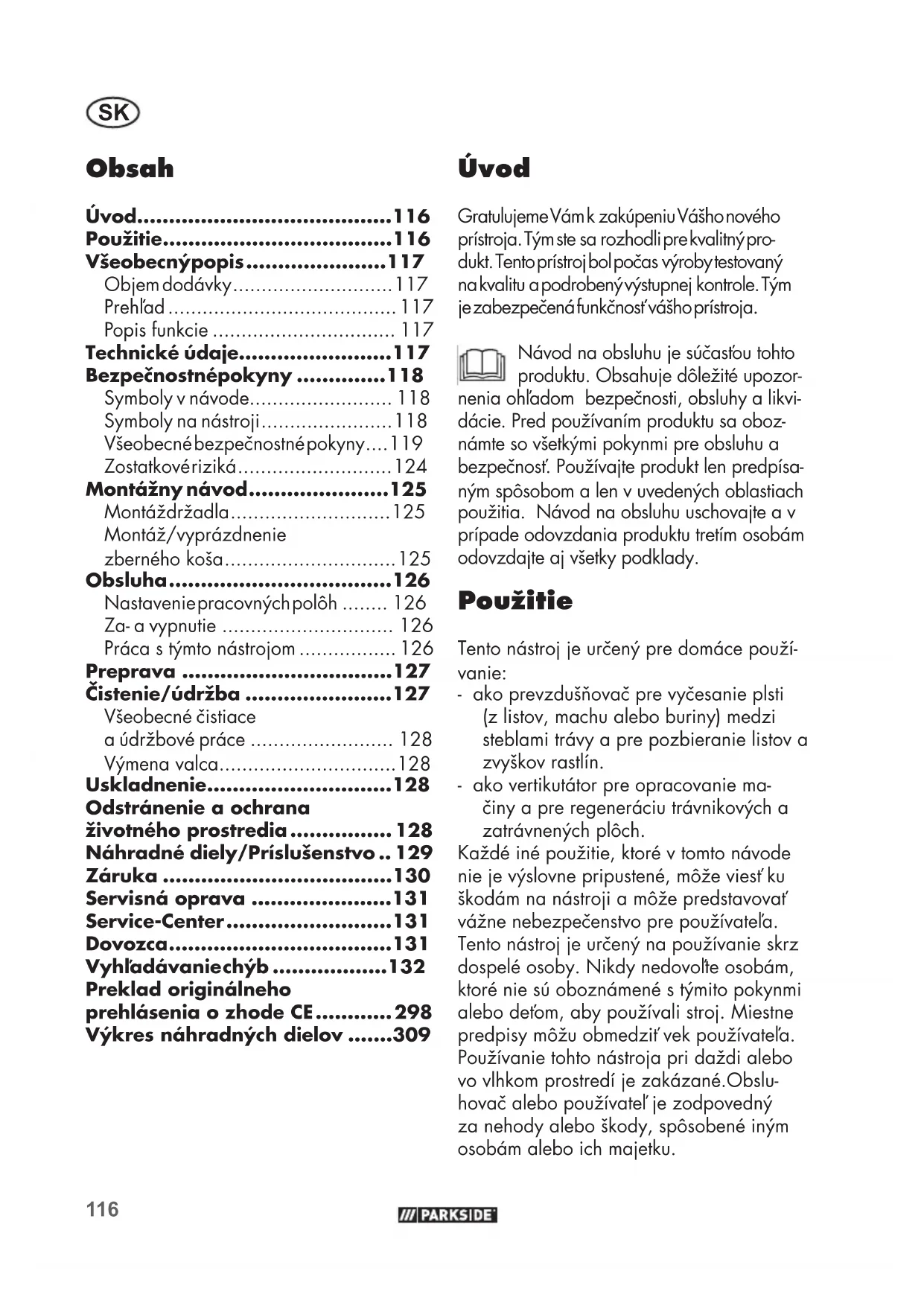 - Úvod Gratulujeme Vám k zakúpeniu Vášho nového prístroja. Tým ste sa rozhodli pre kvalitný pro- dukt. Tento prístroj bol počas výroby testovaný na kvalitu a podrobený výstupnej kontrole. Tým je zabezpečená funkčnosť vášho prístroja. Návod na obsluhu je súčasťou tohto produktu. Obsahuje dôležité upozor- nenia ohľadom bezpečnosti, obsluhy a likvi- dácie. Pred používaním produktu sa oboz- námte so všetkými pokynmi pre obsluhu a bezpečnosť. Používajte produkt len predpísa- ným spôsobom a len v uvedených oblastiach použitia. Návod na obsluhu uschovajte a v prípade odovzdania produktu tretím osobám odovzdajte aj všetky podklady. Použitie Tento nástroj je určený pre domáce použí- vanie: - ako prevzdušňovač pre vyčesanie plsti (z listov, machu alebo buriny) medzi steblami trávy a pre pozbieranie listov a zvyškov rastlín. - ako vertikutátor pre opracovanie ma- činy a pre regeneráciu trávnikových a zatrávnených plôch. Každé iné použitie, ktoré v tomto návode nie je výslovne pripustené, môže viesť ku škodám na nástroji a môže predstavovať vážne nebezpečenstvo pre používateľa. Tento nástroj je určený na používanie skrz dospelé osoby. Nikdy nedovoľte osobám, ktoré nie sú oboznámené s týmito pokynmi alebo deťom, aby používali stroj. Miestne predpisy môžu obmedziť vek používateľa. Používanie tohto nástroja pri daždi alebo vo vlhkom prostredí je zakázané.Obslu- hovač alebo používateľ je zodpovedný za nehody alebo škody, spôsobené iným osobám alebo ich majetku. Preklad originálneho prehlásenia o zhode CE p. 298