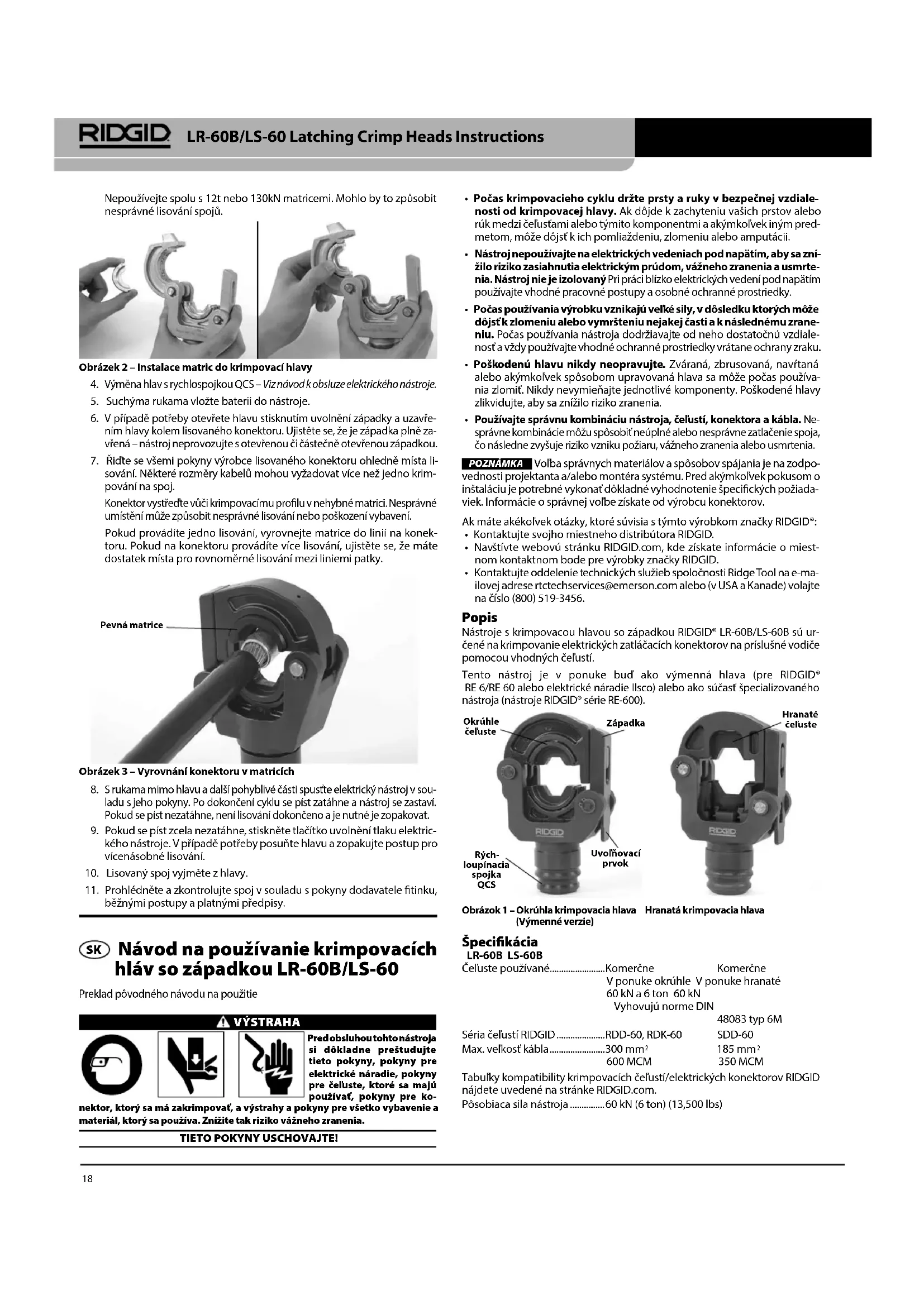 Návod na používanie krimpovacích hláv so západkou LR-60B/LS-60 Preklad pôvodného návodu na použitie VÝSTRAHA Pred obsluhou tohto nástroja si dôkladne preštudujte tieto pokyny, pokyny pre elektrické náradie, pokyny pre čeľuste, ktoré sa majú používať, pokyny pre ko-nektor, ktorý sa má zakrimpovať, a výstrahy a pokyny pre všetko vybavenie a materiál, ktorý sa používa. Znížite tak riziko vážneho zranenia. TIETO POKYNY USCHOVAJTE!