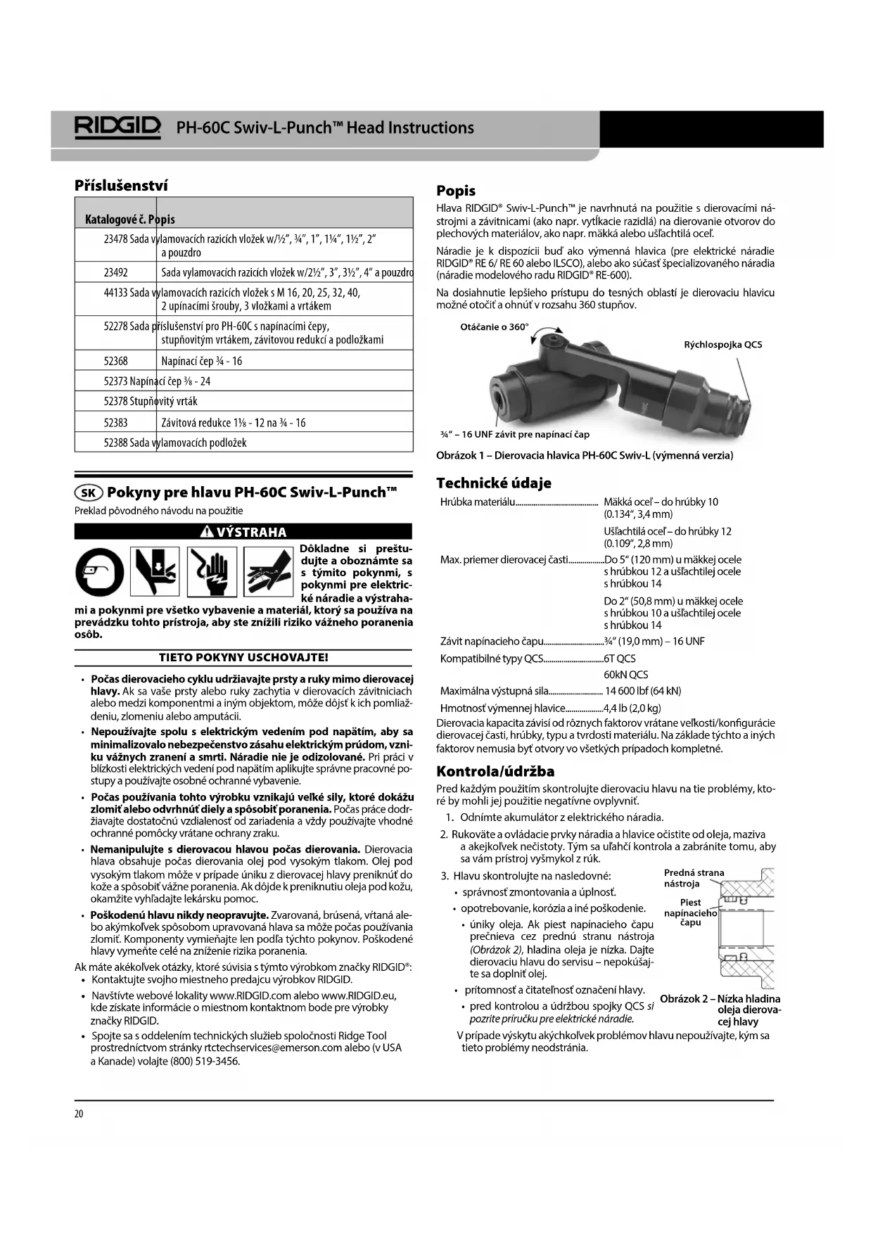 - Poškodenú hlavu nikdy neopravujte. Zvarovaná, brúsená, vŕtaná ale- bo akýmkoľvek spôsobom upravovaná hlava sa môže počas používania zlomiť. Komponenty vymieňajte len podľa týchto pokynov. Poškodené hlavy vymeňte celé na zníženie rizika poranenia. Ak máte akékoľvek otázky, ktoré súvisia s týmto výrobkom značky RIDGID®: • Kontaktujte svojho miestneho predajcu výrobkov RIDGID. • Navštívte webové lokality www.RIDGID.com alebo www.RIDGID.eu, kde získate informácie o miestnom kontaktnom bode pre výrobky značky RIDGID. • Spojte sa s oddelením technických služieb spoločnosti Ridge Tool prostredníctvom stránky rtctechservices@emerson.com alebo (v USA a Kanade) volajte (800) 519-3456. Popis Hlava RIDGID® Swiv-L-Punch™ je navrhnutá na použitie s dierovacími ná-strojmi a závitnicami (ako napr. vytĺkacie razidlá) na dierovanie otvorov do plechových materiálov, ako napr. mäkká alebo ušľachtilá oceľ.Náradie je k dispozícii buď ako výmenná hlavica (pre elektrické náradie RIDGID® RE 6/ RE 60 alebo ILSCO), alebo ako súčasť špecializovaného náradia (náradie modelového radu RIDGID® RE-600).Na dosiahnutie lepšieho prístupu do tesných oblastí je dierovaciu hlavicu možné otočiť a ohnúť v rozsahu 360 stupňov. Rýchlospojka QCS Otáčanie o 360° ¾“ – 16 UNF závit pre napínací čap Obrázok 1 – Dierovacia hlavica PH-60C Swiv-L (výmenná verzia) Technické údaje Hrúbka materiálu.........................................Mäkká oceľ – do hrúbky 10 (0.134“, 3,4 mm)Ušľachtilá oceľ – do hrúbky 12 (0.109”, 2,8 mm)Max. priemer dierovacej časti..................Do 5“ (120 mm) u mäkkej ocele s hrúbkou 12 a ušľachtilej ocele shrúbkou 14Do 2“ (50,8 mm) u mäkkej ocele s hrúbkou 10 a ušľachtilej ocele shrúbkou 14Závit napínacieho čapu..............................¾” (19,0 mm) – 16 UNFKompatibilné typy QCS..............................6T QCS60kN QCSMaximálna výstupná sila........................... 14 600 lbf (64 kN)Hmotnosť výmennej hlavice...................4,4 lb (2,0 kg)Dierovacia kapacita závisí od rôznych faktorov vrátane veľkosti/kongurácie dierovacej časti, hrúbky, typu a tvrdosti materiálu. Na základe týchto a iných faktorov nemusia byť otvory vo všetkých prípadoch kompletné. Kontrola/údržba Pred každým použitím skontrolujte dierovaciu hlavu na tie problémy, kto-ré by mohli jej použitie negatívne ovplyvniť.
