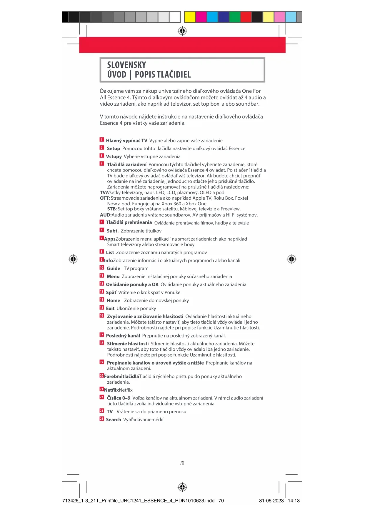 Search Vyhľadávanie médií 713426_1-3_21T_Printfile_URC1241_ESSENCE_4_RDN1010623.indd 70713426_1-3_21T_Printfile_URC1241_ESSENCE_4_RDN1010623.indd 70 31-05-2023 14:1331-05-2023 14:1371 Diaľkový ovládač Essence 4 je prednastavený na okamžité ovládanie vybraných najpopulárnejších zariadení. Ak vlastníte jedno z nasledujú