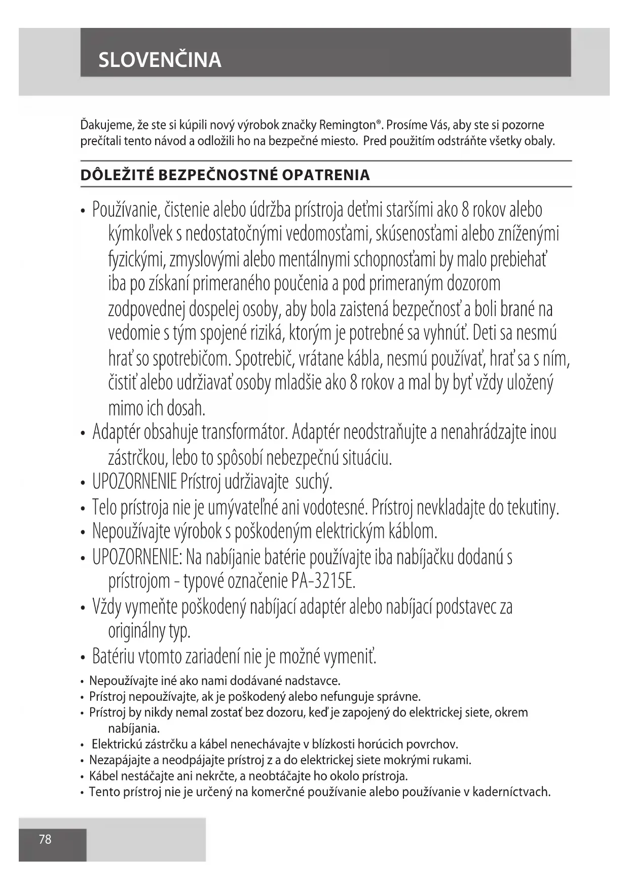 AE78 Ďakujeme, že ste si kúpili nový výrobok značky Remington®. Prosíme Vás, aby ste si pozorne prečítali tento návod a odložili ho na bezpečné miesto. Pred použitím odstráňte všetky obaly.